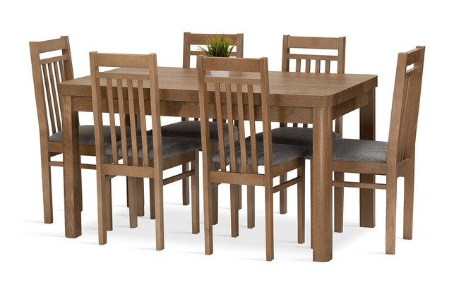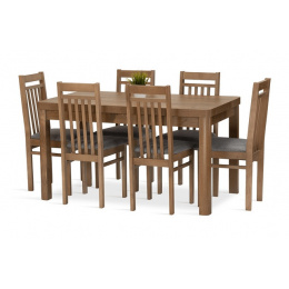 Jídelní sestava Meteor 6 se skládá z rozkládacího stolu a šesti židlí. Tato jídelní sestava splní svůj účel na výbornou nejen v kuchyni, ale i v jídelně, nebo obývacím pokoji s jídelním koutem. Svou vysokou kvalitou a precizním zpracováním, uspokojí všechny budoucí, i ty velmi náročné, uživatele. Nohy stolu a kostry židlí jsou vyrobeny z bukového dřeva, mořeného tak, aby ladily s deskou stolu, která je vyrobená z lamina v dekoru dub lefkas. Jídelní sestava je dodávaná v demontu. Součástí balení je schématický montážní návod, včetně všech potřebných spojovacích prvků. Cena je uvedena za jídelní stůl a 6 židlí. Vlivem nastavení monitorů, nebo displejů telefonů, se zobrazení barev na fotograii může od skutečnosti lišit. Úvodní fotografie je ilustrační. Židle budou dodány v zelené barvě.