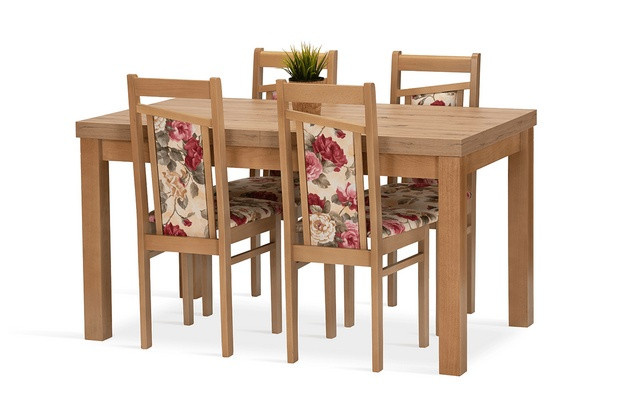 Jídelní sestava Polar 4 se skládá z rozkládacího stolu a čtyř židlí. Tato jídelní sestava splní svůj účel na výbornou nejen v kuchyni, ale i v jídelně, nebo obývacím pokoji s jídelním koutem. Svou vysokou kvalitou a precizním zpracováním, uspokojí všechny budoucí, i ty velmi náročné, uživatele. Nohy stolu a kostry židlí jsou vyrobeny z bukového dřeva, mořeného tak, aby ladily s deskou stolu, která je vyrobená z lamina v dekoru dub artisan. Jídelní sestava je dodávaná v demontu. Součástí balení je schématický montážní návod, včetně všech potřebných spojovacích prvků. Cena je uvedena za jídelní stůl a 4 židle. Vlivem nastavení monitorů, nebo displejů telefonů, se zobrazení barev na fotograii může od skutečnosti lišit.