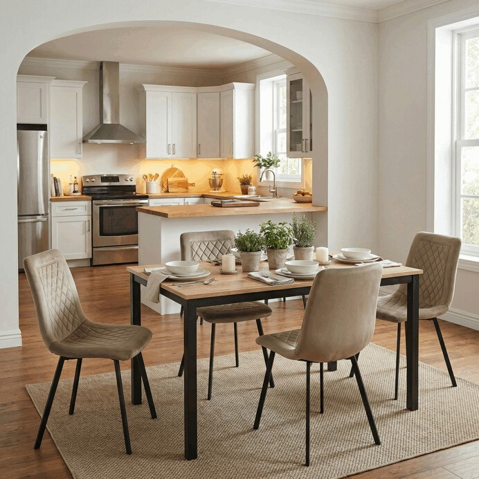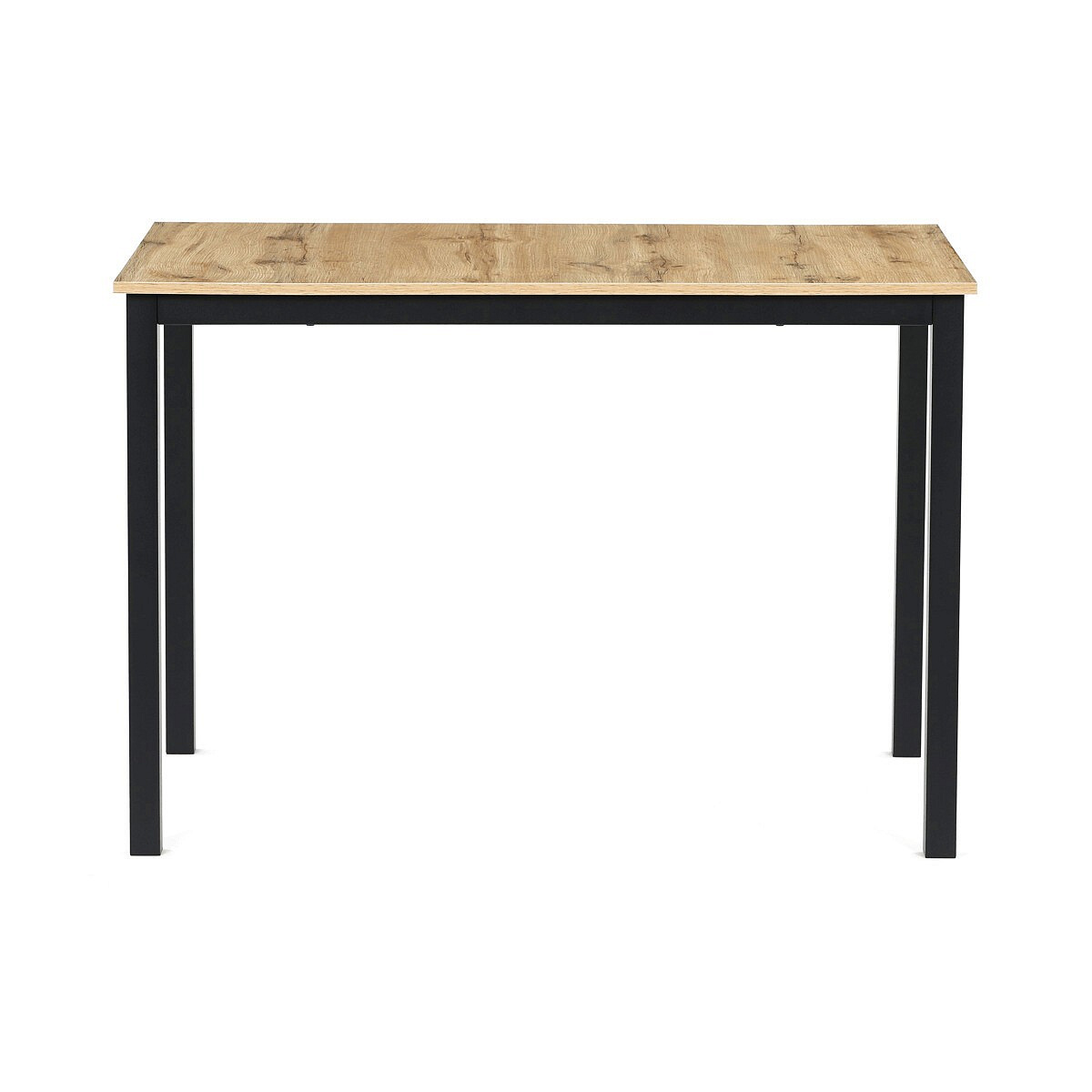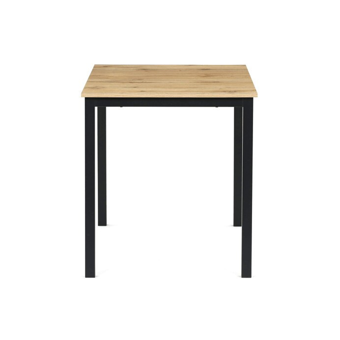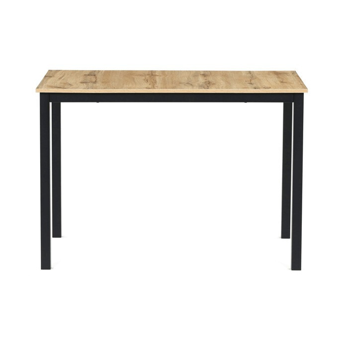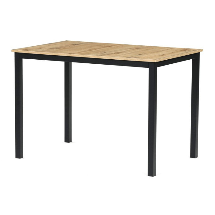 Jídelní stůl o rozměrech 110x70x75 cm kombinuje desku z MDF s dekorem divokého dubu a stabilní kovovou podnož v černém matném laku. Deska je navržena pro snadnou údržbu a odolnost vůči běžnému opotřebení, což zajišťuje dlouhodobou životnost. Kovová podnož poskytuje pevnou a stabilní oporu, která udržuje stůl bezpečně na místě během používání. Moderní design s přírodními odstíny dřeva se hodí do různých interiérů, od jídelny po pracovní kout. Stůl není rozkládací, což podtrhuje jeho kompaktní a praktické provedení.