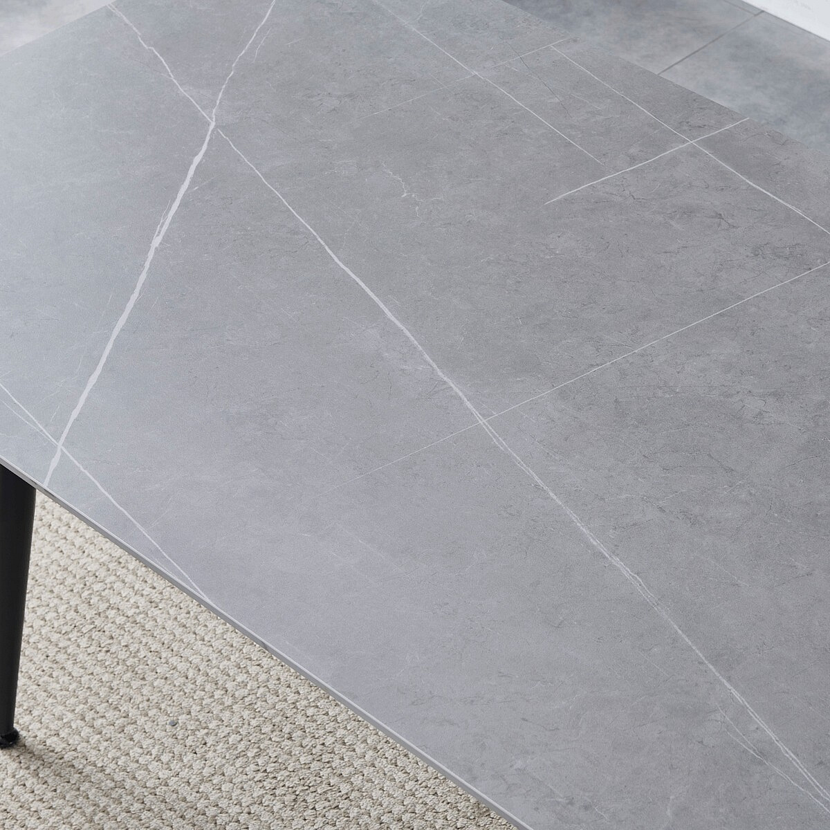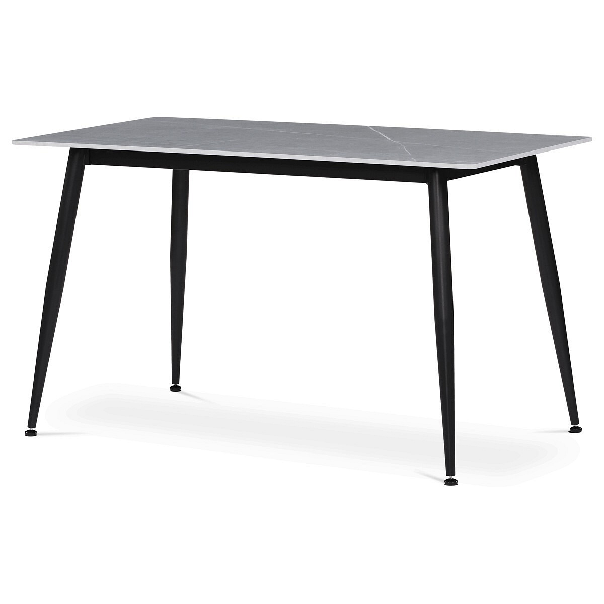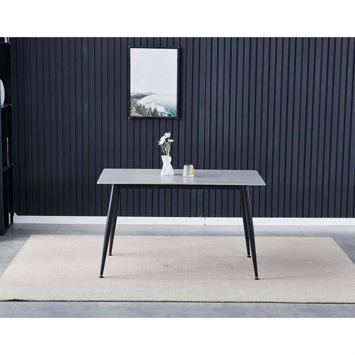 Jídelní stůl s rozměry 130x70x76 cm nabízí desku z kvalitní slinuté keramiky v imitaci matného šedého mramoru, která je odolná vůči poškrábání a snadno se udržuje. Černé kovové nohy s mírně zkoseným tvarem zajišťují stabilitu a pevnost celé konstrukce, přičemž jejich povrchová úprava zabraňuje korozi. Zaoblené rohy desky přispívají k bezpečnosti a zároveň dodávají moderní vzhled. Stůl je vhodný pro každodenní použití v jídelnách i kuchyních, kde oceníte kombinaci praktičnosti a stylového designu. Díky pevnému materiálu a kvalitnímu zpracování je navržen pro dlouhou životnost.