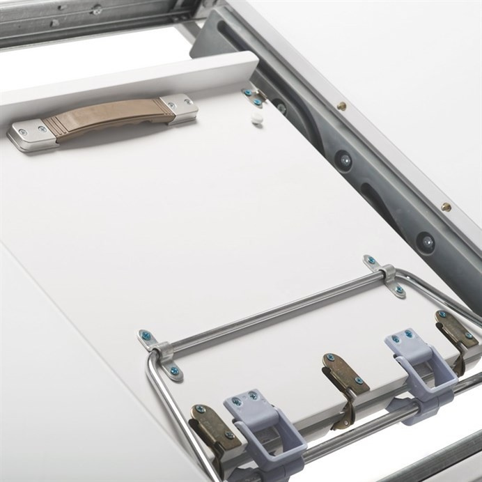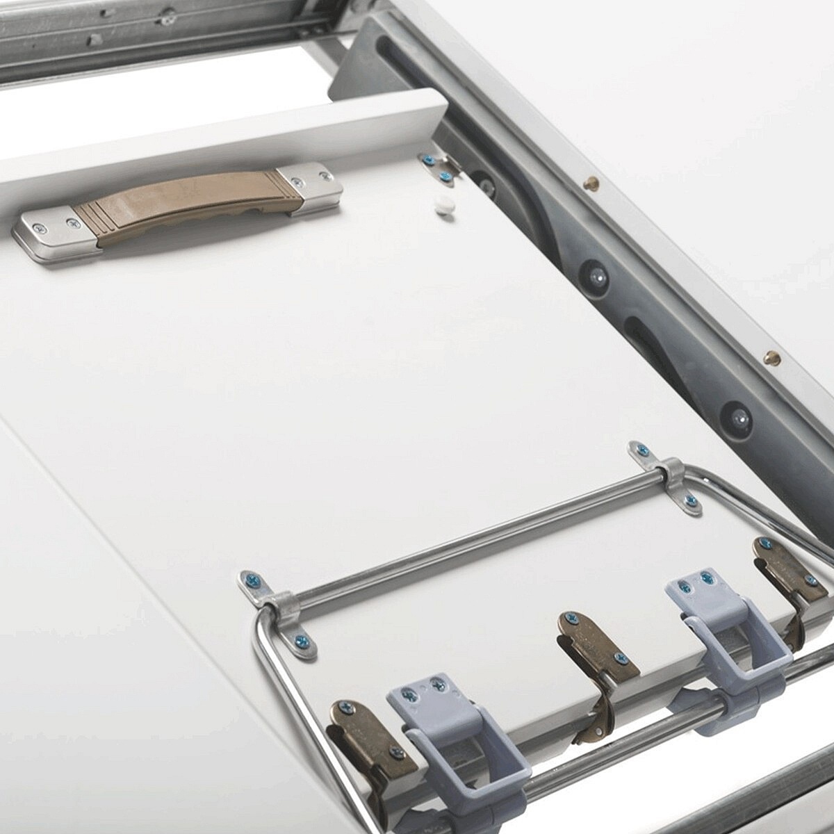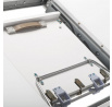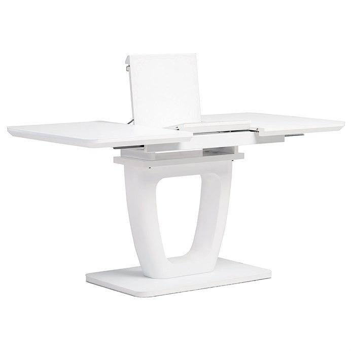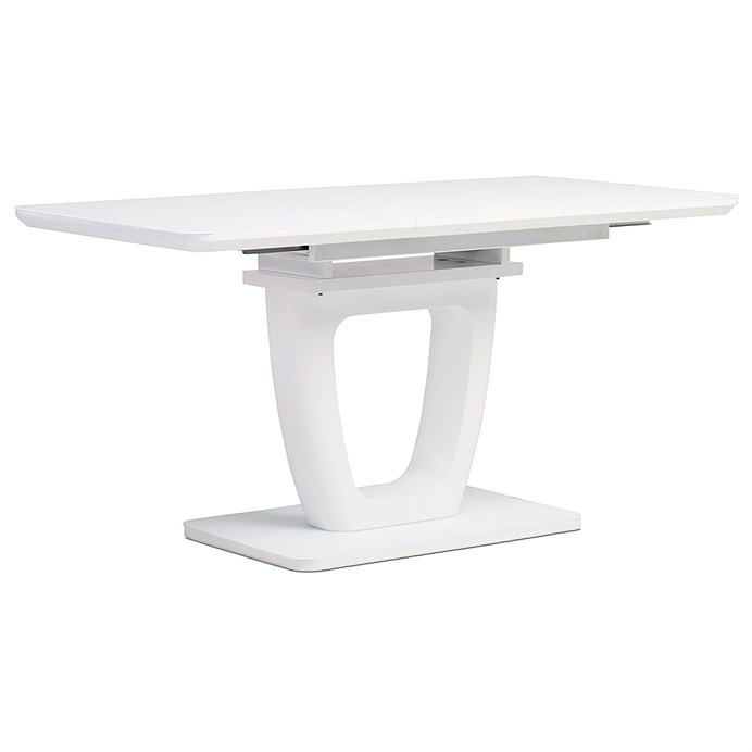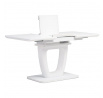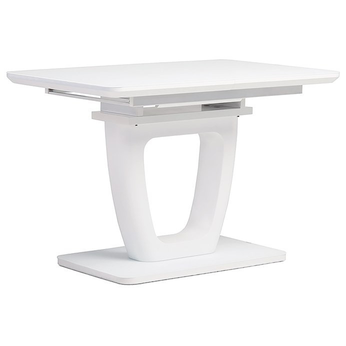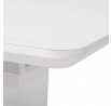 Designový jídelní rozkládací stůl o rozměru 110 + 40 x 75 cm. Vrchní stolová deska je tvrzeného skla tl. 4 mm v bílé barvě. Díl rozkladu je také krytý bílým sklem jako celá stolová deska, což nepatří ke standardům a řadí stůl do vyšší kategorie. Podkladová deska, centrální noha je z MDF je čistě bílá v matném provedení. Podesta je z také z MDF a krytá sklem v barvě. Ze spodní části opatřená plastovými kluzáky, eleminujícími poškození povrchů tvrdých podlah. Mechanické součásti jsou kovové. Stůl jistě zaujme svým nadčasovým designem i skvěloým zpracováním detailu a v neposlední řadě i barvou a stane se elegantním prvkem v moderních i klasicky laděných jídelnách, kuchyních a obývacích prostorách. Výška stolu je 76 cm. Ke stolu je možné umístit až 6 židlí.