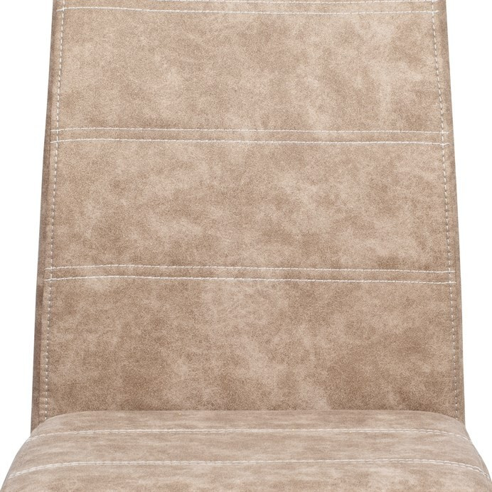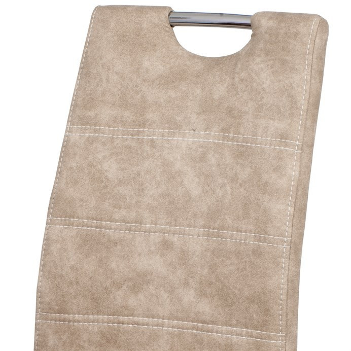 Jídelní židle HC-483 CRM3 v béžovém odstínu s potahem z látky v dekoru vintage kůže kombinuje stylový vzhled s praktickými vlastnostmi. Čalounění z kvalitní látky připomínající kůži je příjemné na dotek a snadno se udržuje, zatímco pevná kovová chromovaná podnož zajišťuje stabilitu a odolnost. Židle je vybavena pohupovým mechanismem, který přispívá k pohodlí při sezení, a ergonomicky tvarovaným opěradlem s praktickým úchytem pro snadnou manipulaci. Absence područek umožňuje větší variabilitu použití a snadné zasunutí pod stůl. Celková výška a rozměry židle jsou navrženy tak, aby poskytovaly komfortní posezení během jídel i delších setkání.