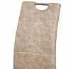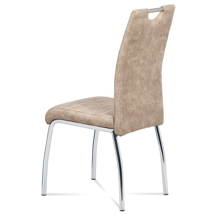 Jídelní židle s potahem z krémové látky v dekoru vintage kůže nabízí příjemný vzhled a pohodlí při sezení. Čalounění je zdobeno bílým prošitím, které podtrhuje stylový design. Pevné kovové nohy s chromovaným povrchem zajišťují stabilitu a dlouhou životnost. Židle nemá područky ani výškové nastavení, což ji činí kompaktní a snadno kombinovatelnou s různými typy jídelních stolů. Praktický otvor v opěradle umožňuje snadnou manipulaci a přenášení.