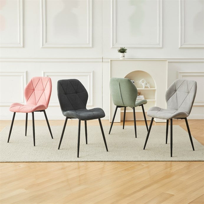 Židle je čalouněná kvalitní látkou, která je měkká na dotek a zároveň odolná proti opotřebení. Ergonomicky tvarované sedadlo a opěradlo s dekorativním prošíváním poskytují vysoký komfort i při delším sezení. Židle stojí na pevných kovových nohách v černém provedení, které zajišťují stabilitu a dlouhou životnost. Nohy jsou elegantně zkosené, což dodává židli moderní vzhled a zajišťuje pevnou stabilitu.