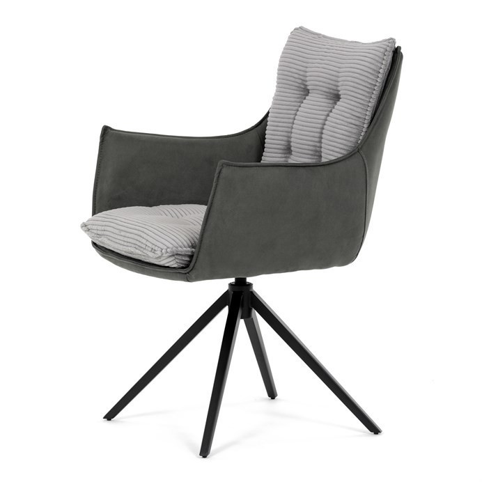 Jídelní židle DCH-D1345 GREY2 značky Autronic vyniká otočným 360° vratným mechanismem, který zajišťuje plynulý a tichý návrat do výchozí polohy, což přispívá k pohodlí a praktičnosti při používání. Konstrukce židle kombinuje pevný černý kovový rám s moderním designem čtyřnohé podnože, která zaručuje stabilitu a dlouhou životnost. Sedák a opěradlo jsou potaženy kombinací dvou typů šedé látky, přičemž vnitřní část tvoří měkký, žebrovaný textil s vysokým polstrováním, které poskytuje ergonomickou podporu a komfort i při delším sezení. Čalounění je pečlivě prošité a tvarované tak, aby zvýraznilo estetiku a zároveň zajistilo dostatečnou prodyšnost materiálu. Područky jsou integrovány do celkové konstrukce sedáku, což zvyšuje komfort bez omezení pohybu. Díky kombinaci kvalitních materiálů a funkčních prvků je židle vhodná pro moderní jídelny i pracovní prostory, kde je kladen důraz na design i uživatelský komfort.