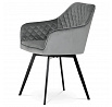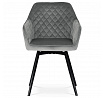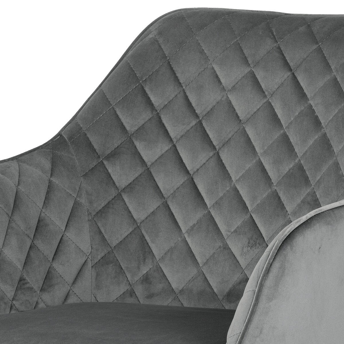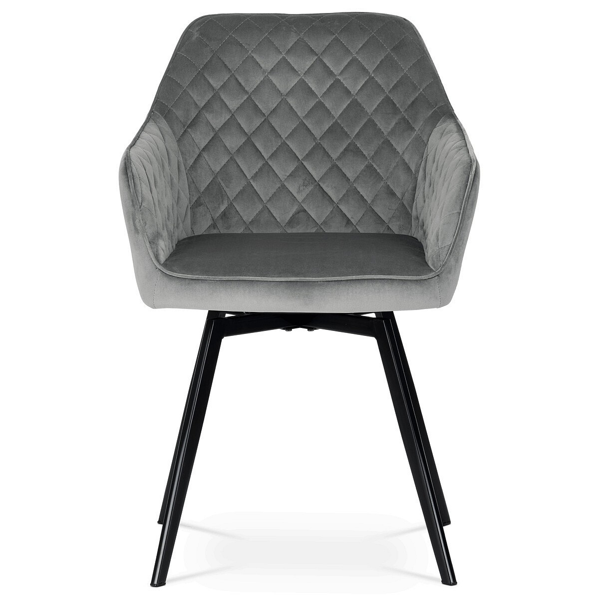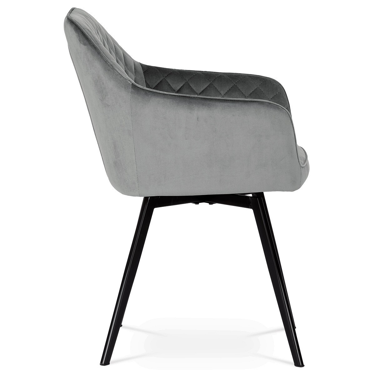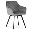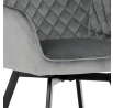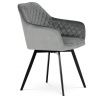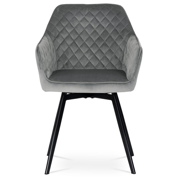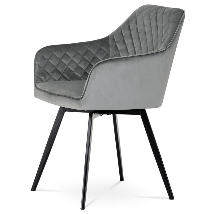 Díky svému dokonalému designu je tato židle v industriálním stylu nezaměnitelná a zároveň velmi pohodlná. Skořepina sedáku a opěradla má potah z kvalitní látky v stříbřitě šedém matném sametu. Polstrování je z PU pěny. Velmi dekorativním prvkem je výrazné kosočtvercové prošití vnitřních ploch v barvě potahu a paspule po obvodu celé skořepiny. Vybraná látka se také velmi dobře čistí. Stabilitu židle zajišťují čtyři kónické kovové nohy obdélníkového průřezu s kvalitním práškovým nástřikem v černé matné barvě. Ukončené jsou černými plastovými kluzáky, zabraňující poškození tvrdých povrchů podlah. Tato provedení produkují z tohoto modelu židle skvělou volbu pro zařízení obývacích či jídelních, ale také zasedacích místností. Nosnost židle je 110 kg. Bonusem této židle je otočný a vratným mechanismus, který umožňuje otáčení o 90° doleva a o 90° doprava a zároveň vždy vrátí sedák do původní polohy. Díky němu žiidle zůstanou vždy srovnané u stolu.