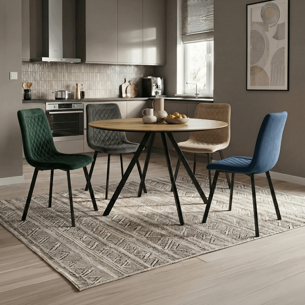 Jídelní židle s označením DCL-973 GREY4 nabízí kombinaci komfortu a moderního designu. Sedák i opěradlo jsou čalouněné příjemnou šedou sametovou látkou, která je doplněna výrazným prošíváním v kosočtverečném vzoru, jež podtrhuje estetiku a zároveň zvyšuje odolnost potahu. Stabilní kovová podnož v matné černé barvě zajišťuje pevnou oporu a dlouhou životnost židle. Absence područek a otočného mechanismu umožňuje snadné zasunutí pod stůl a šetří prostor v jídelně. Židle je vhodná pro každodenní použití a díky kvalitnímu zpracování materiálů se snadno udržuje.