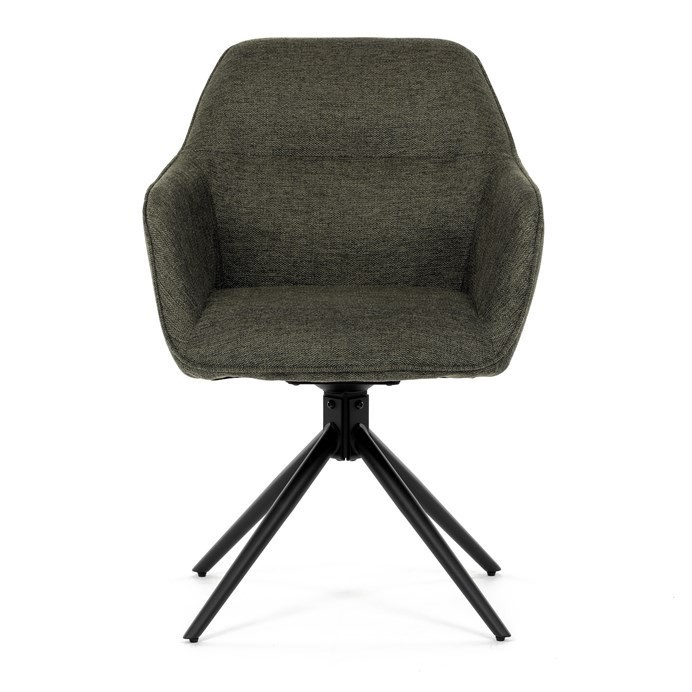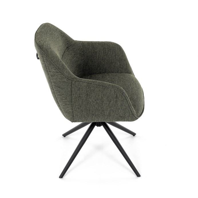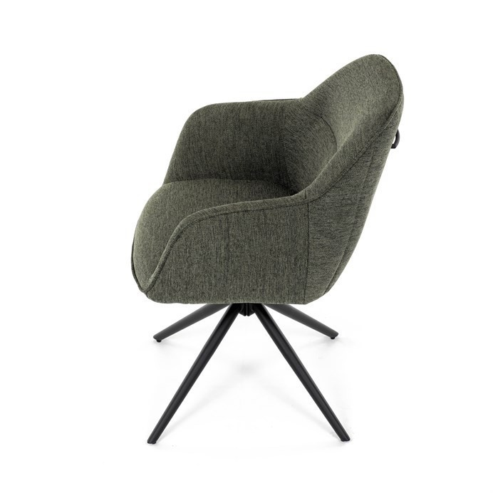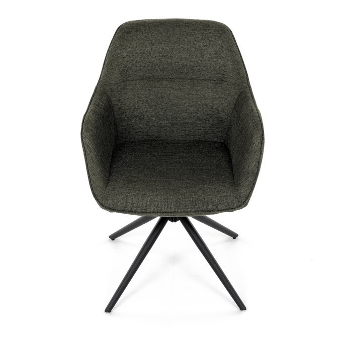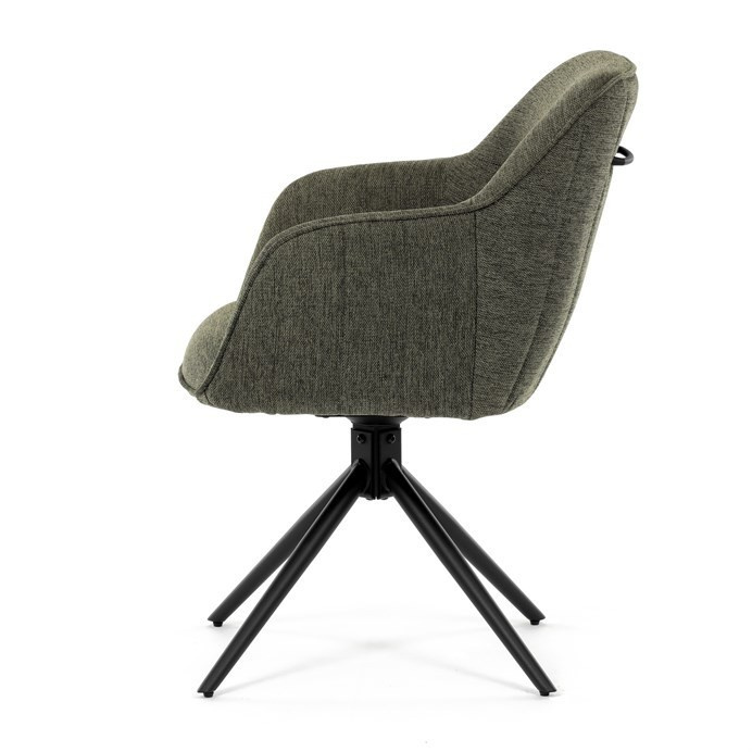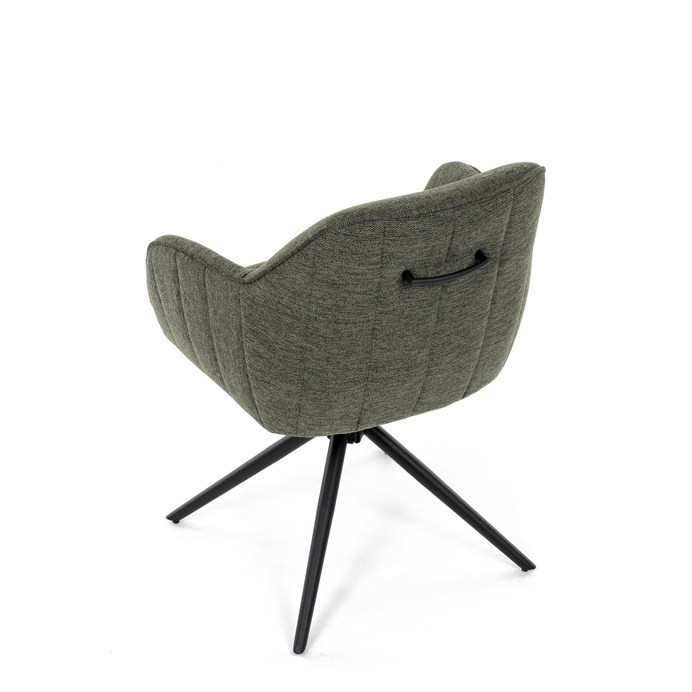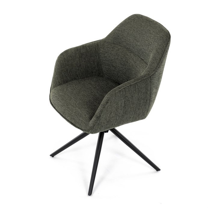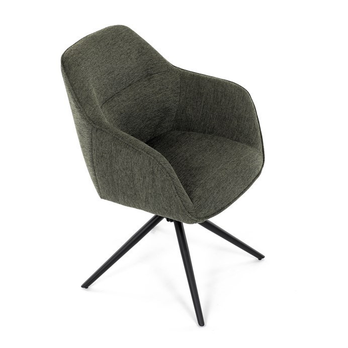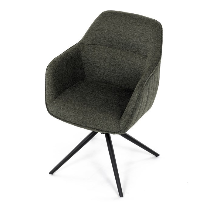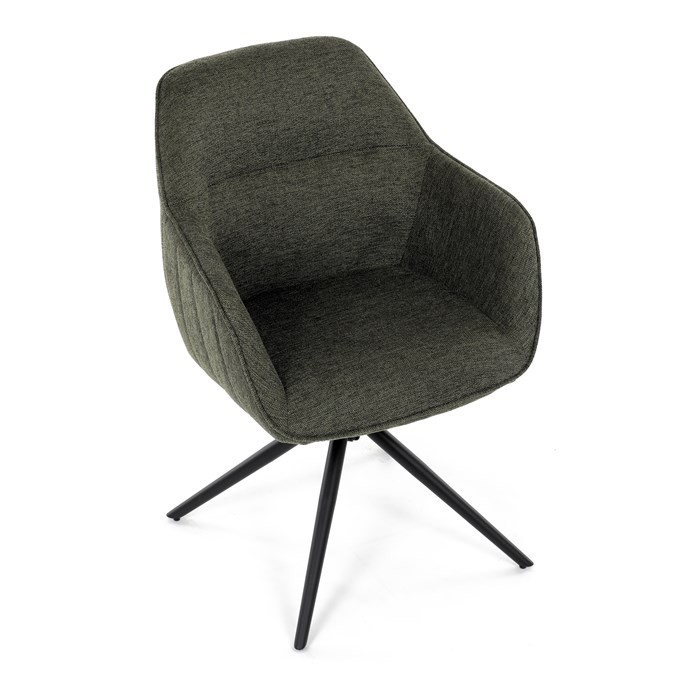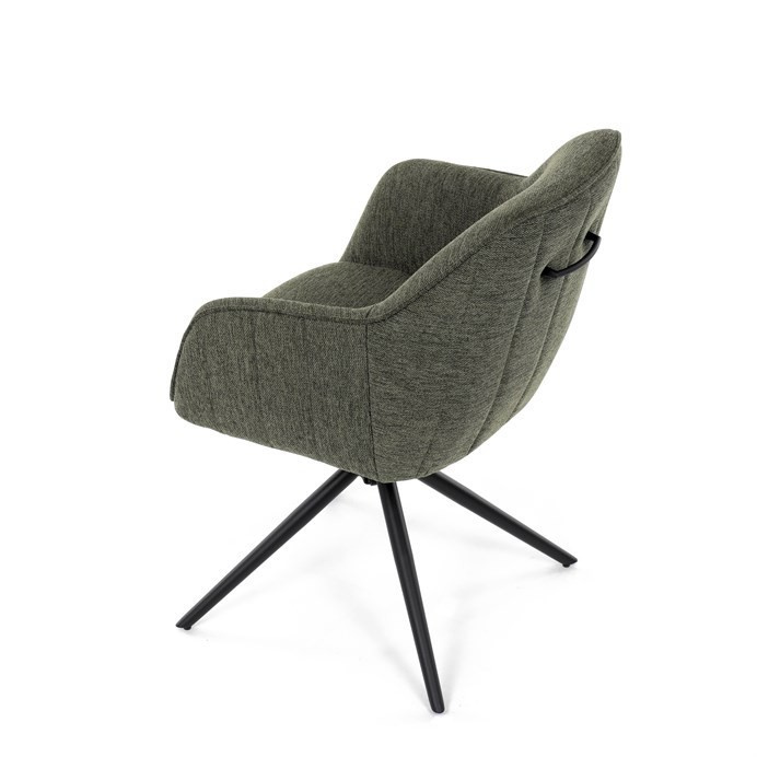 Moderní jídelní židle v zelené barvě s efektním prošitím zádové i přední části opěráku. Prošití je v brvě potahového materiálu. Zadní část opěráku je opatřena vkusným madlem pro snazší manipulaci. Čtyři kovové nohy v matném práškovém nástřiku vycházejí z centrálního bodu ve středu sedáku. Sedák je otočný o P90°+ L 90° s vratným mechanismem - funkce reset.