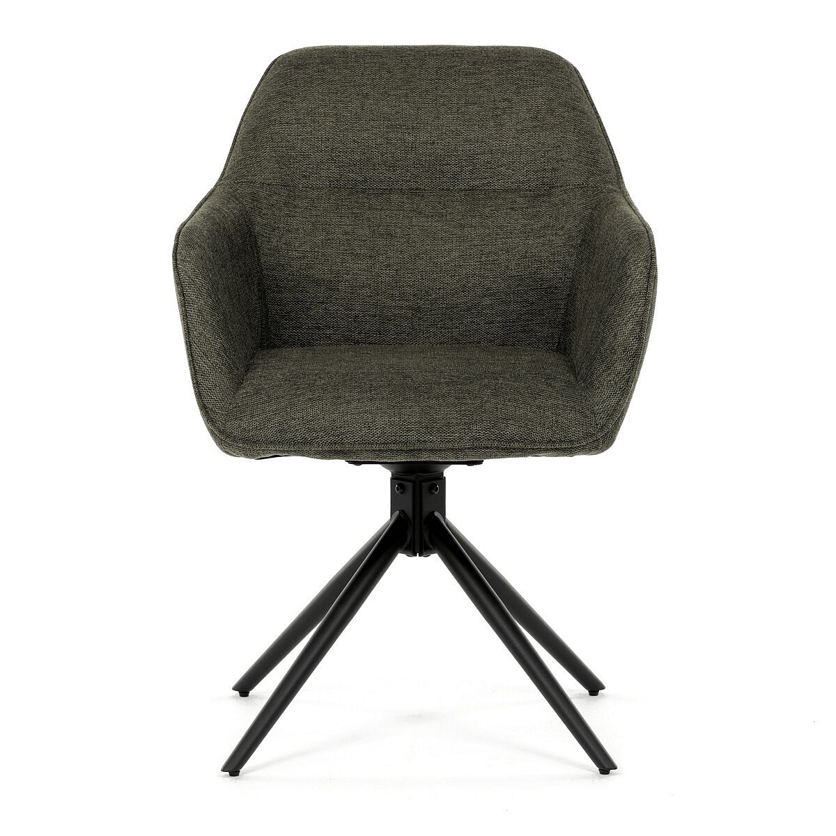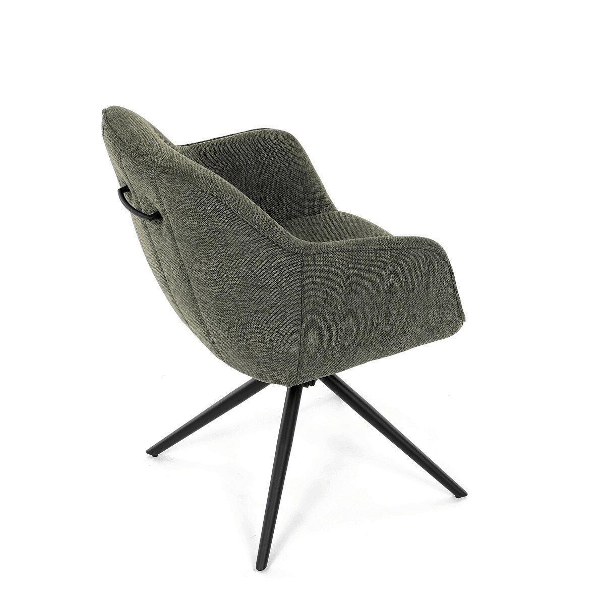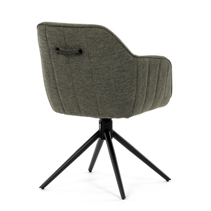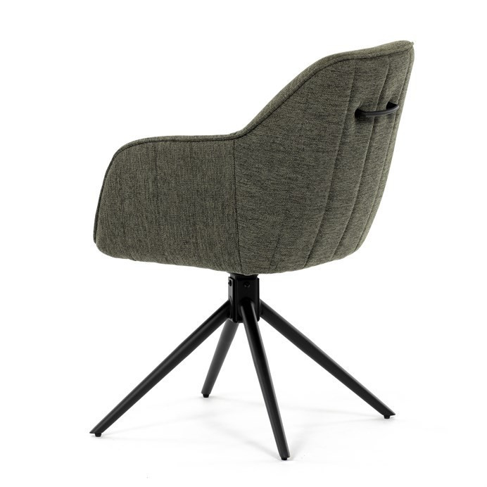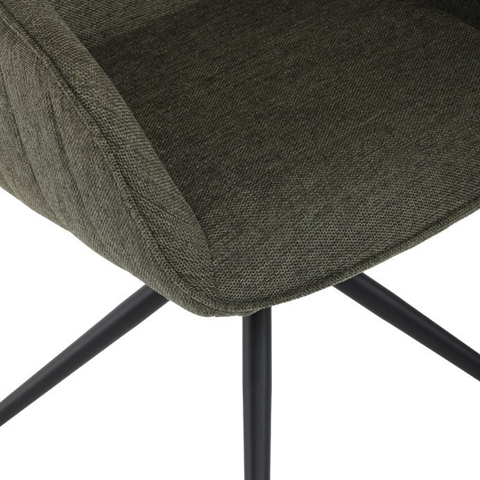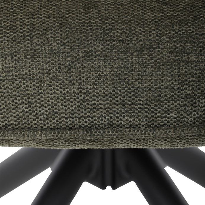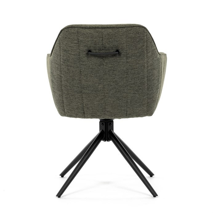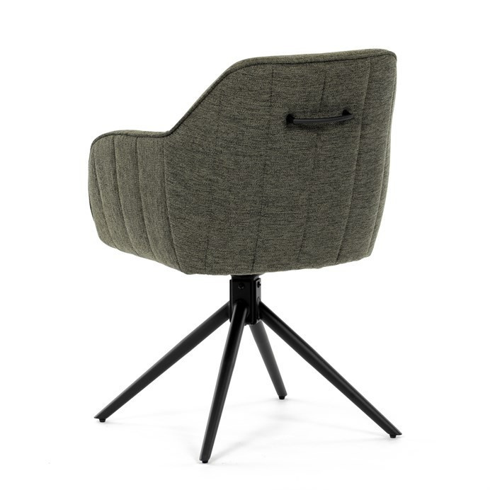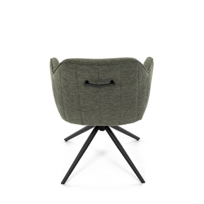 Moderní jídelní židle v zelené barvě s efektním prošitím zádové i přední části opěráku. Prošití je v brvě potahového materiálu. Zadní část opěráku je opatřena vkusným madlem pro snazší manipulaci. Čtyři kovové nohy v matném práškovém nástřiku vycházejí z centrálního bodu ve středu sedáku. Sedák je otočný o P90°+ L 90° s vratným mechanismem - funkce reset.