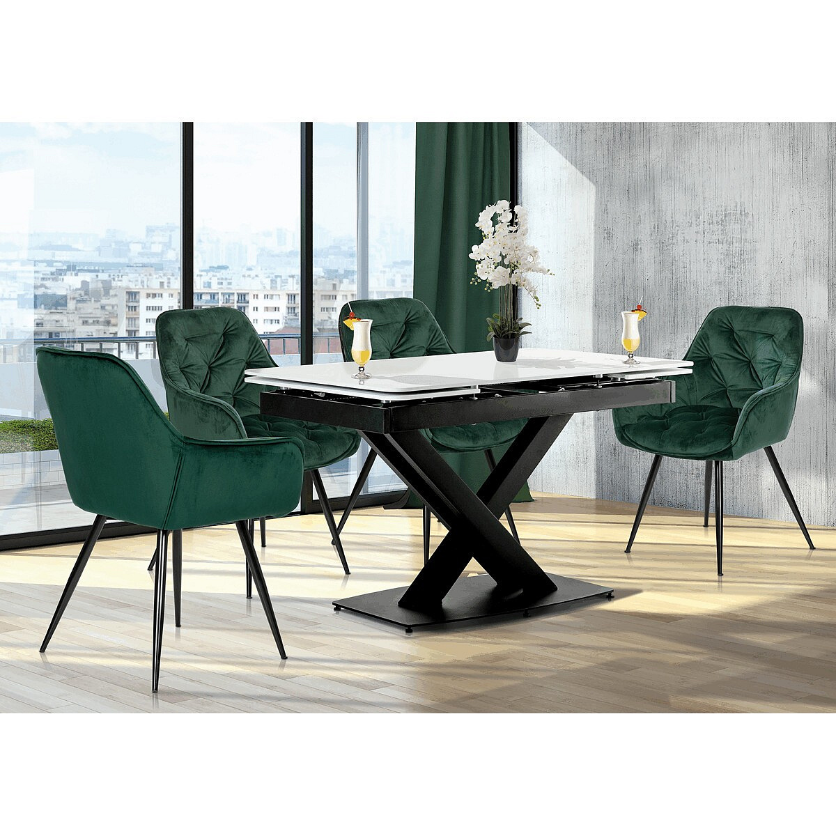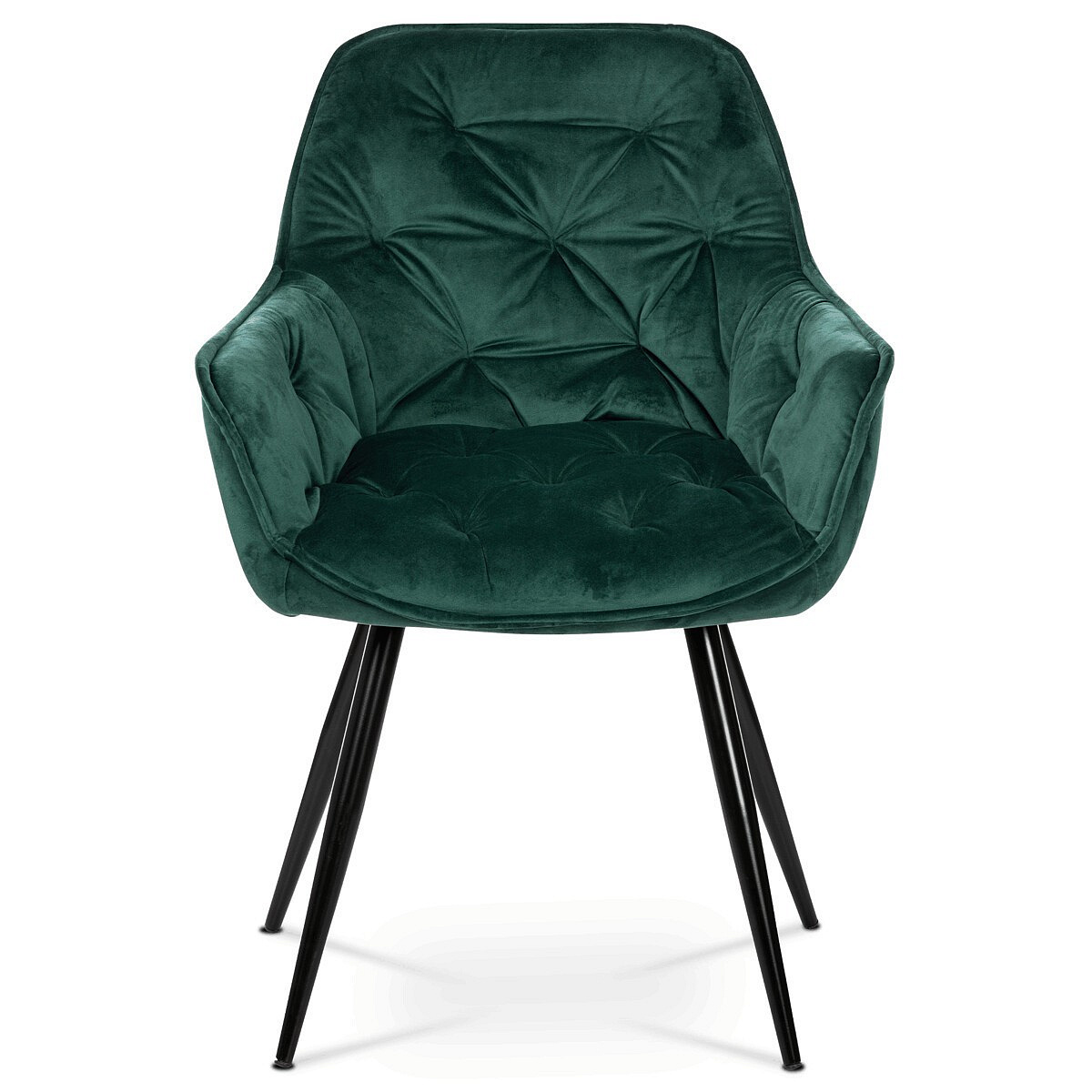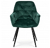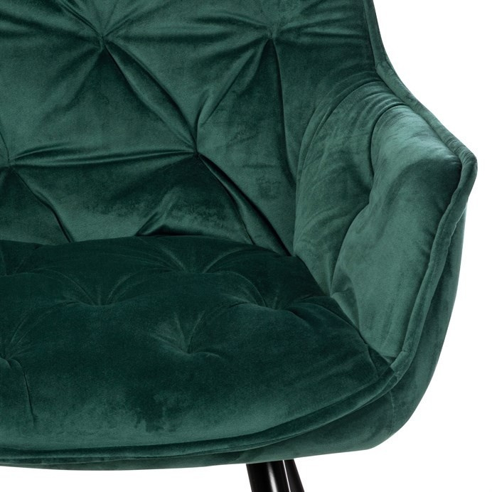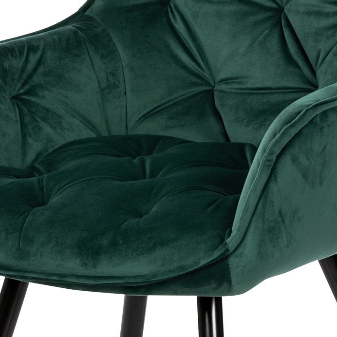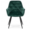 Jídelní židle s označením DCH-421 GRN4 nabízí komfortní sezení díky sametovému potahu v zelené barvě, který je příjemný na dotek a snadno se udržuje. Čalouněné opěradlo a sedák jsou zdobeny designovým prošitím, které dodává židli elegantní vzhled a zároveň zvyšuje její odolnost. Pevná čtyřnohý podnož z kovu s černým lakem zajišťuje stabilitu a dlouhou životnost. Židle je vybavena integrovanými područkami, které podporují pohodlnou pozici při sezení. Díky svým rozměrům a konstrukci je vhodná pro použití v jídelnách i moderně zařízených interiérech.