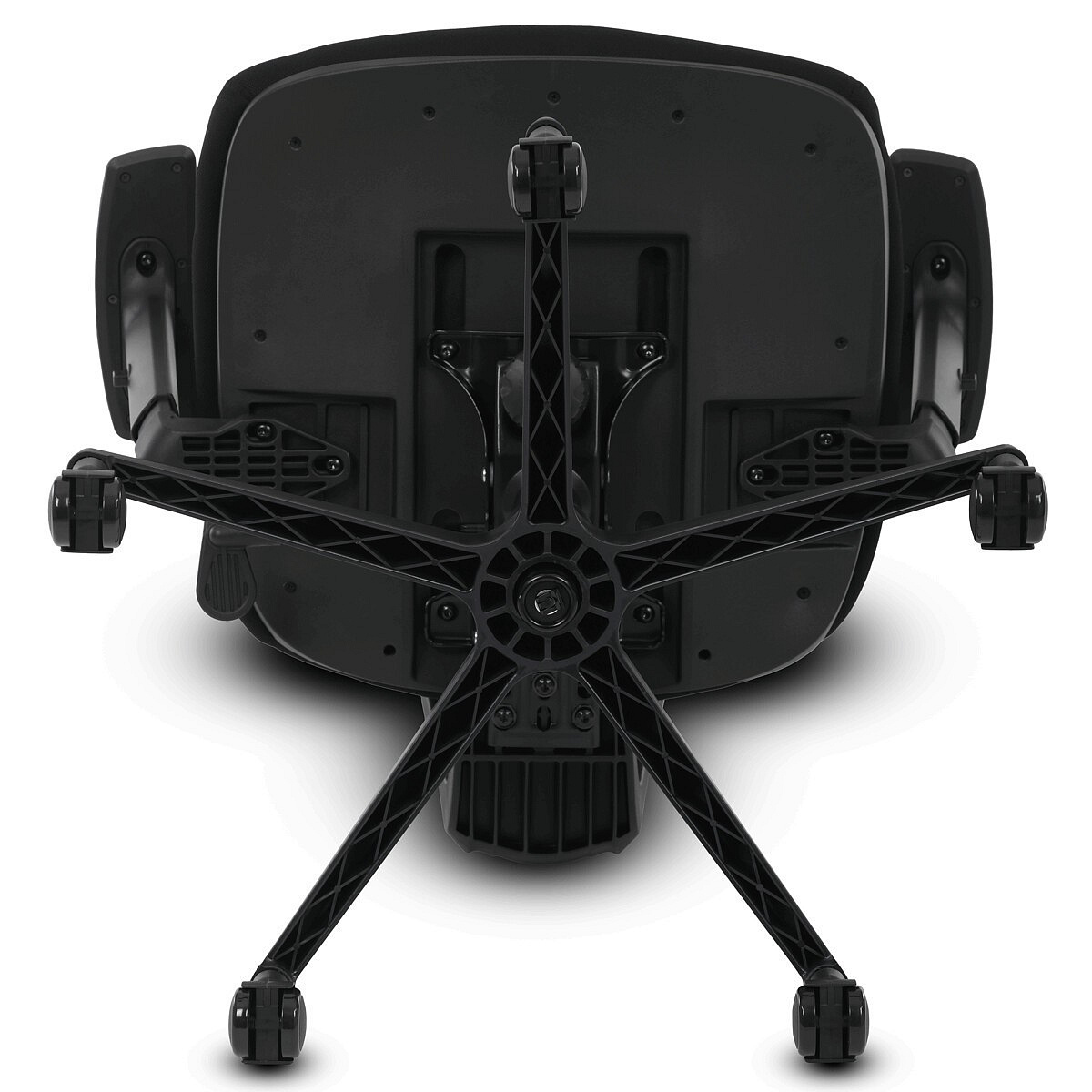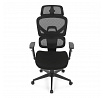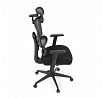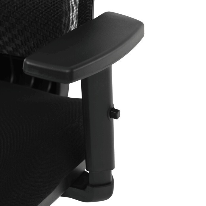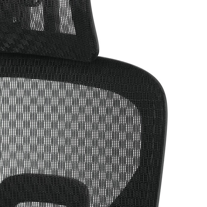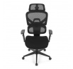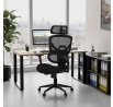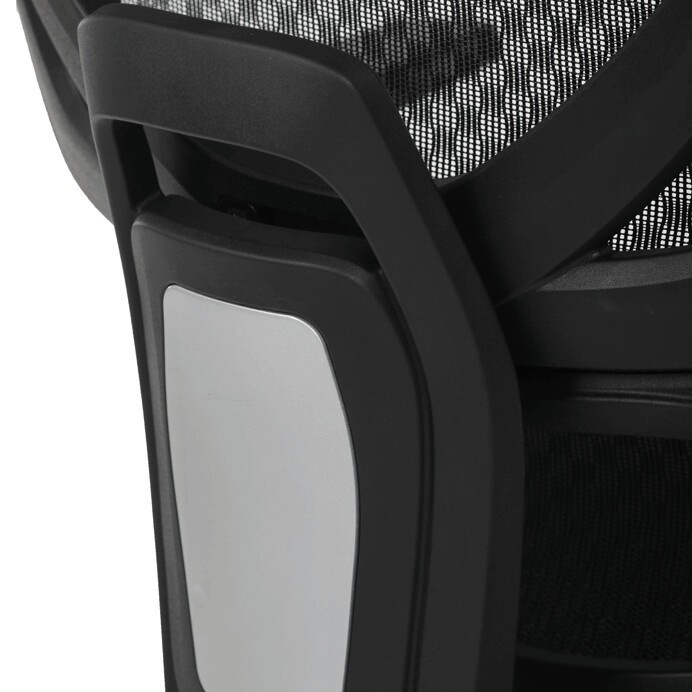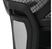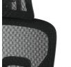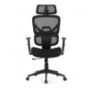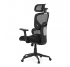 Kancelářská židle s černým mesh potahem nabízí vysoký komfort díky synchronnímu mechanismu, který umožňuje plynulé nastavení opěradla v závislosti na pohybu těla. Výškově nastavitelná bederní opěrka a opěrka hlavy podporují správné držení těla během dlouhých hodin sezení. Sedák je čalouněný látkou v jemném světle modrém odstínu s vyměkčenou vrchní částí pro lepší pohodlí. Područky jsou 1D typu s možností jednoduchého vertikálního nastavení, což umožňuje přizpůsobení individuálním potřebám uživatele. Stabilní plastový kříž s kolečky zajišťuje snadnou mobilitu a pevnost celé židle.