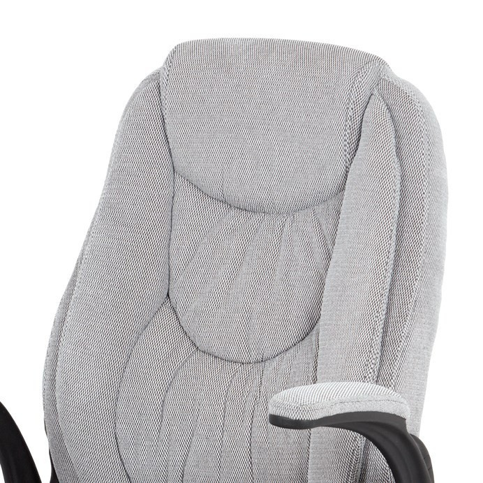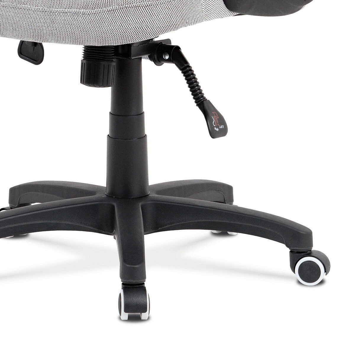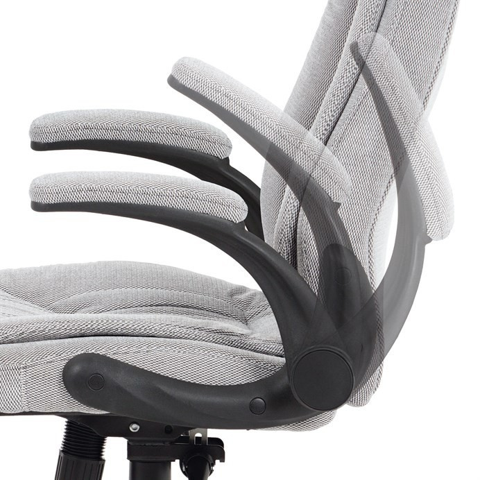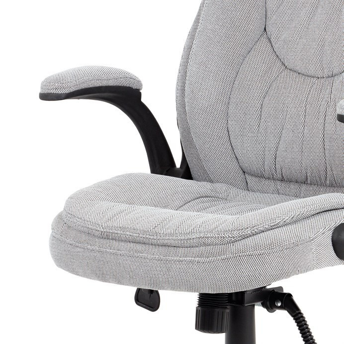 Kancelářská židle v šedé látce nabízí ergonomicky tvarované opěradlo s vyměkčenou vrchní částí pro zvýšený komfort při delším sezení. Odklápěcí čalouněné područky umožňují flexibilní využití a snadné zasunutí židle pod stůl. Synchronní mechanismus zajišťuje plynulé nastavení opěradla v závislosti na pohybu uživatele, což podporuje správné držení těla. Plastový černý kříž je lehký a zároveň stabilní, vybavený kolečky vhodnými pro různé typy podlah. Výškově nastavitelná sedací plocha umožňuje přizpůsobení individuálním potřebám uživatele.