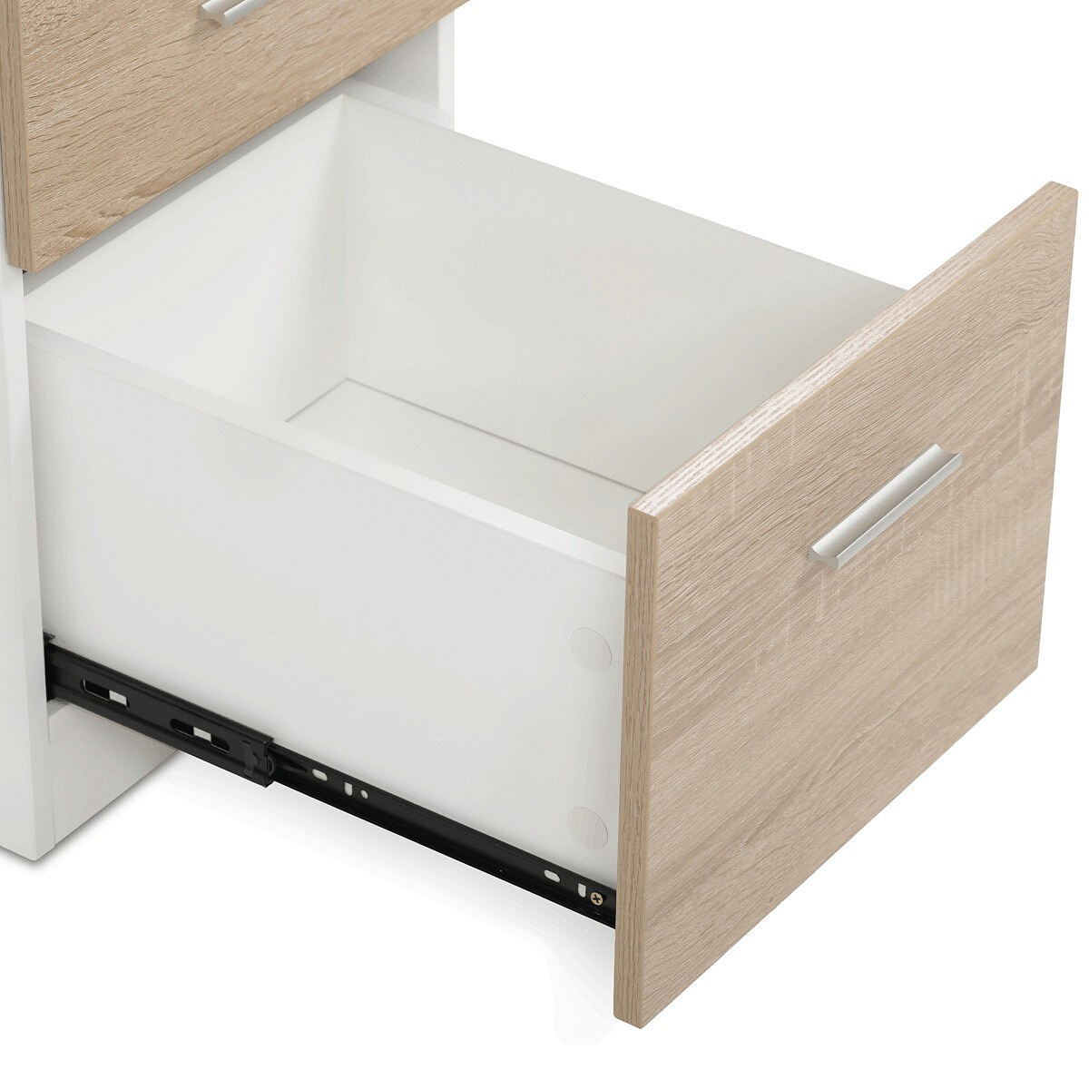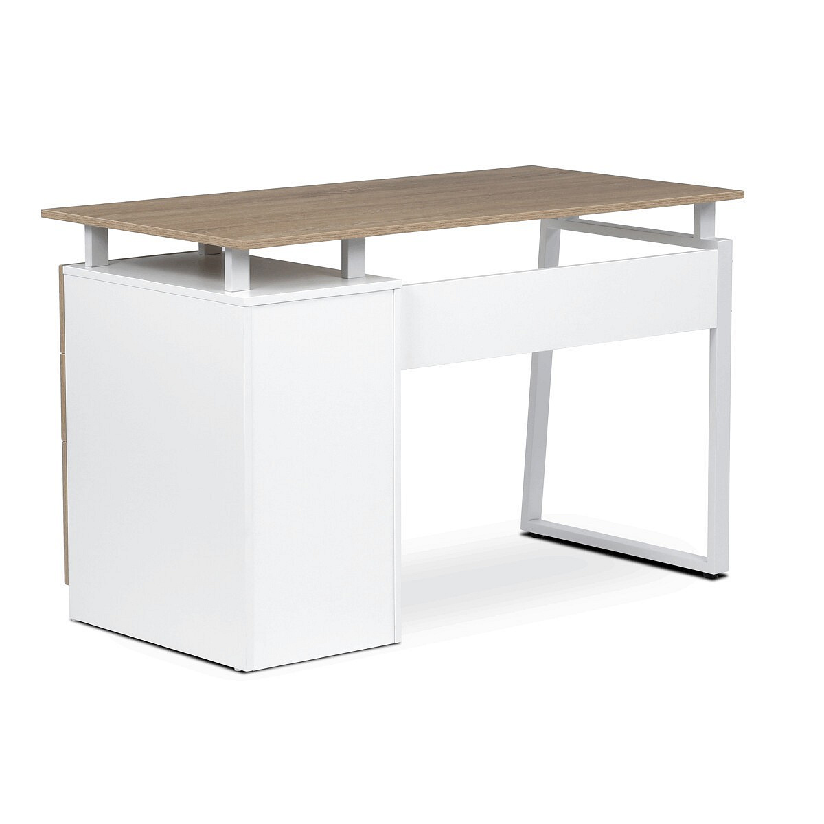 Pracovní stůl se šuplíky v dekoru dub sonoma kombinuje praktický úložný prostor s moderním designem vhodným do kanceláří i domácích pracovních koutů. Deska stolu je vyrobena z melaminu s matnou povrchovou úpravou, která zajišťuje odolnost proti poškrábání a snadnou údržbu. Pevné kovové nohy v bílé barvě poskytují stabilní oporu a dodávají celku industriální nádech. Tři prostorné zásuvky s kovovými úchytkami umožňují efektivní organizaci pracovních potřeb. Rozměry 120x60x75 cm nabízejí dostatek prostoru pro práci i uložení dokumentů.