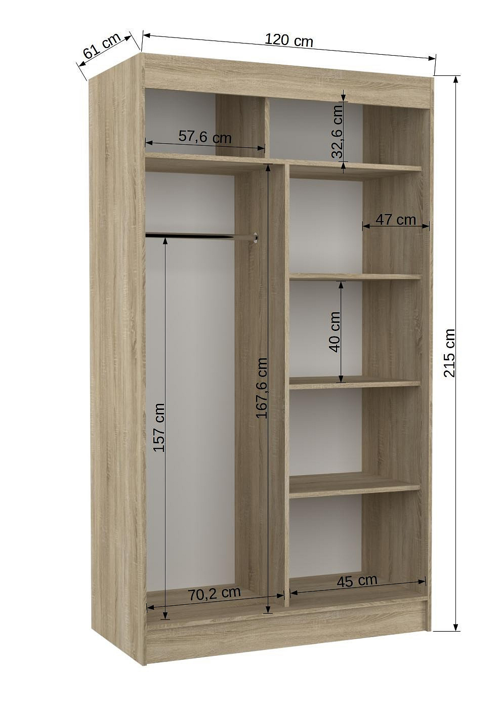 A tolóajtós KAREN szekrény ideális módja a tér rendezésének. A bútor tágas polcokkal és egy rúddal van felszerelve, amelyre felakaszthatja a ruhákat, öltönyöket, felsőruházatot vagy ingeket. Az elülső oldalon díszes lacobelek találhatók, amelyek kivételes stílust kölcsönöznek a bútornak. Annak köszönhetően, hogy a szekrény tolóajtós, nem kell további helyet biztosítani az ajtók kinyitásához, ami ideális megoldássá teszi egy kis szoba vagy keskeny előszoba számára.