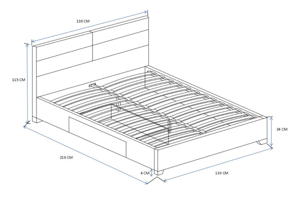 Kényelmes alvást és pihenést biztosít elegendő hellyel. A 130 cm szélességével, 115 cm maximális magasságával és 218 cm hosszúságával az ágy könnyen elfér a legtöbb hálószobában anélkül, hogy túl sok helyet foglalna el.Praktikus tárolóhely