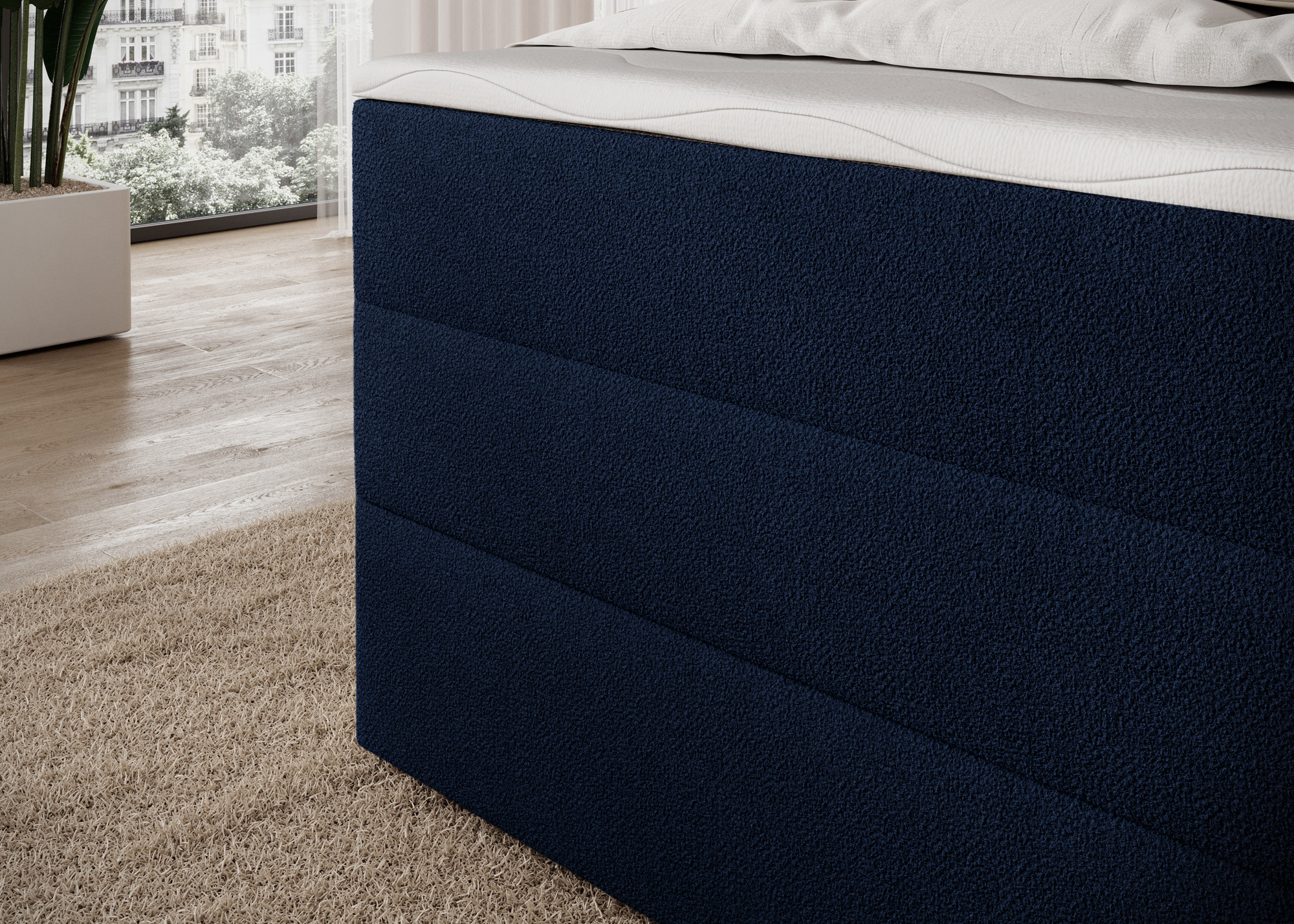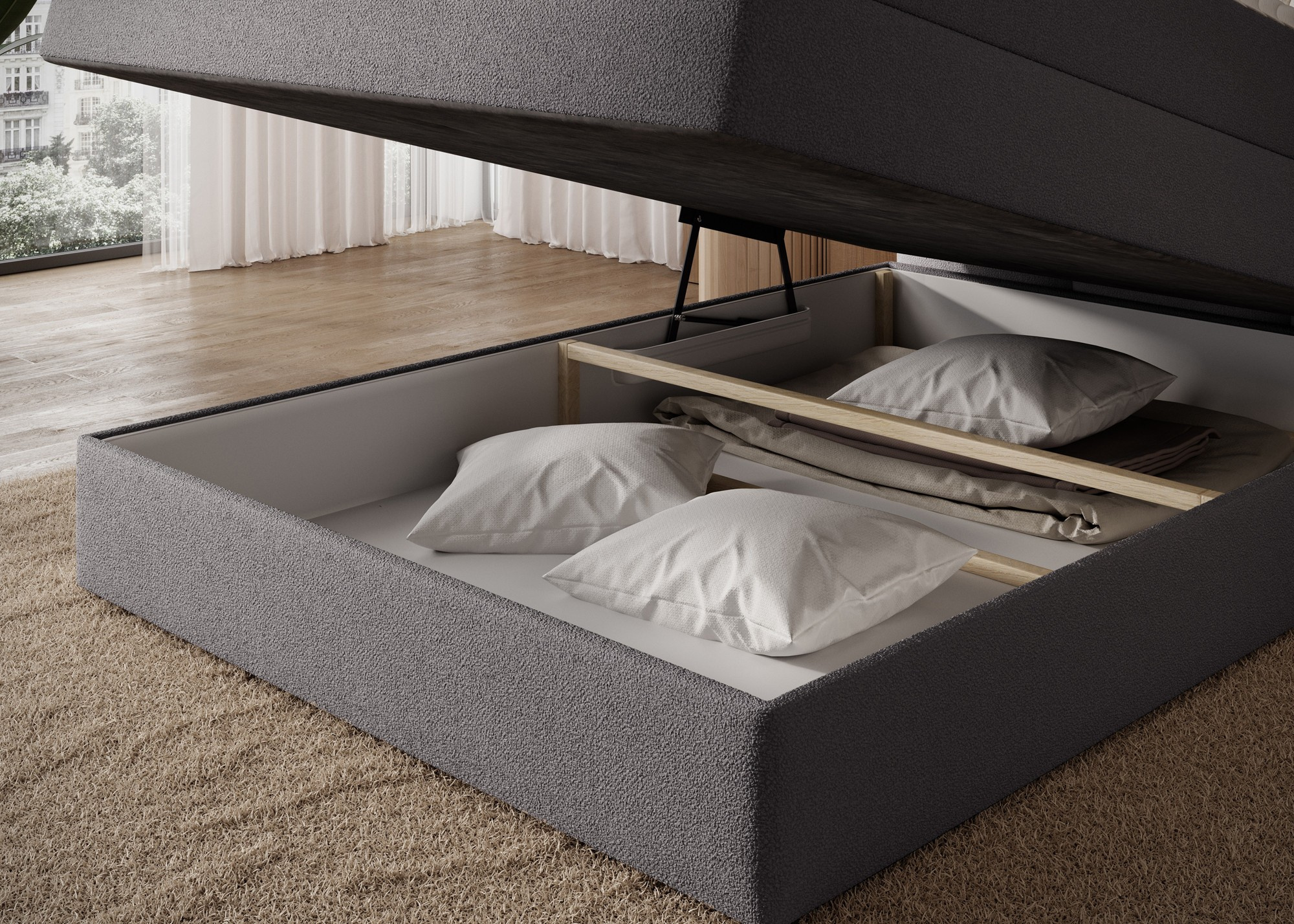 The Kasped continental bed is a modern and functional choice for any bedroom, available in two sizes: 215x121x108 cm and 215x141x108 cm, allowing it to be easily adapted to individual needs and room dimensions. The bed's construction is based on a sturdy frame made of solid wood and chipboard, ensuring long-lasting stability and durability. At the heart of the design lies a bonell spring mattress, permanently mounted onto the frame, which offers reliable body support and promotes proper air circulation for a healthy and ergonomic sleep experience. In addition, the bed features two layers of high-quality foam – foam T2130 and foam T2540 – which, in combination with the bonell spring unit, enhance flexibility, comfort, and body contour adaptation, supporting restful and regenerative sleep. The entire structure is defined by clean lines and a modern aesthetic, complemented by black furniture legs made of durable plastic, which add visual lightness while ensuring structural integrity. A highly practical feature is the built-in bedding container, providing convenient storage space for duvets, pillows, or other textiles, helping to keep the bedroom neat and organized. The Kasped bed combines premium craftsmanship, contemporary design, and everyday functionality, making it a perfect fit for both modern and more classic interior arrangements.
