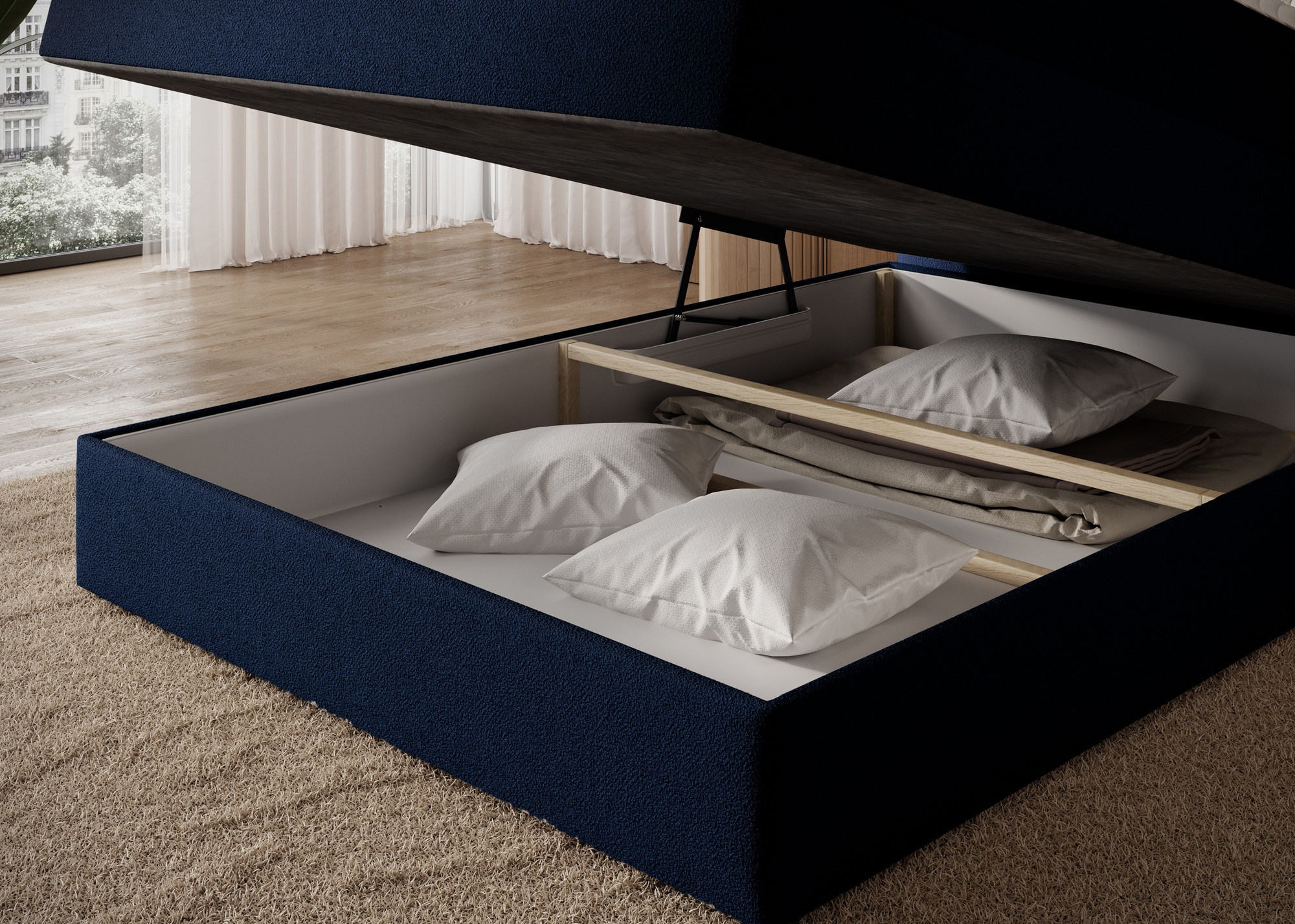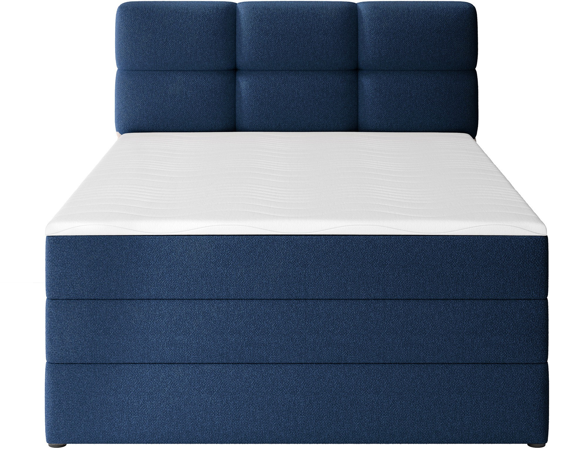 The Kasped continental bed is a modern and functional choice for any bedroom, available in two sizes: 215x121x108 cm and 215x141x108 cm, allowing it to be easily adapted to individual needs and room dimensions. The bed's construction is based on a sturdy frame made of solid wood and chipboard, ensuring long-lasting stability and durability. At the heart of the design lies a bonell spring mattress, permanently mounted onto the frame, which offers reliable body support and promotes proper air circulation for a healthy and ergonomic sleep experience. In addition, the bed features two layers of high-quality foam – foam T2130 and foam T2540 – which, in combination with the bonell spring unit, enhance flexibility, comfort, and body contour adaptation, supporting restful and regenerative sleep. The entire structure is defined by clean lines and a modern aesthetic, complemented by black furniture legs made of durable plastic, which add visual lightness while ensuring structural integrity. A highly practical feature is the built-in bedding container, providing convenient storage space for duvets, pillows, or other textiles, helping to keep the bedroom neat and organized. The Kasped bed combines premium craftsmanship, contemporary design, and everyday functionality, making it a perfect fit for both modern and more classic interior arrangements.