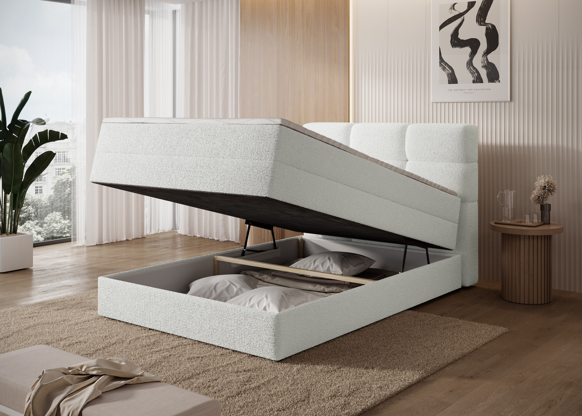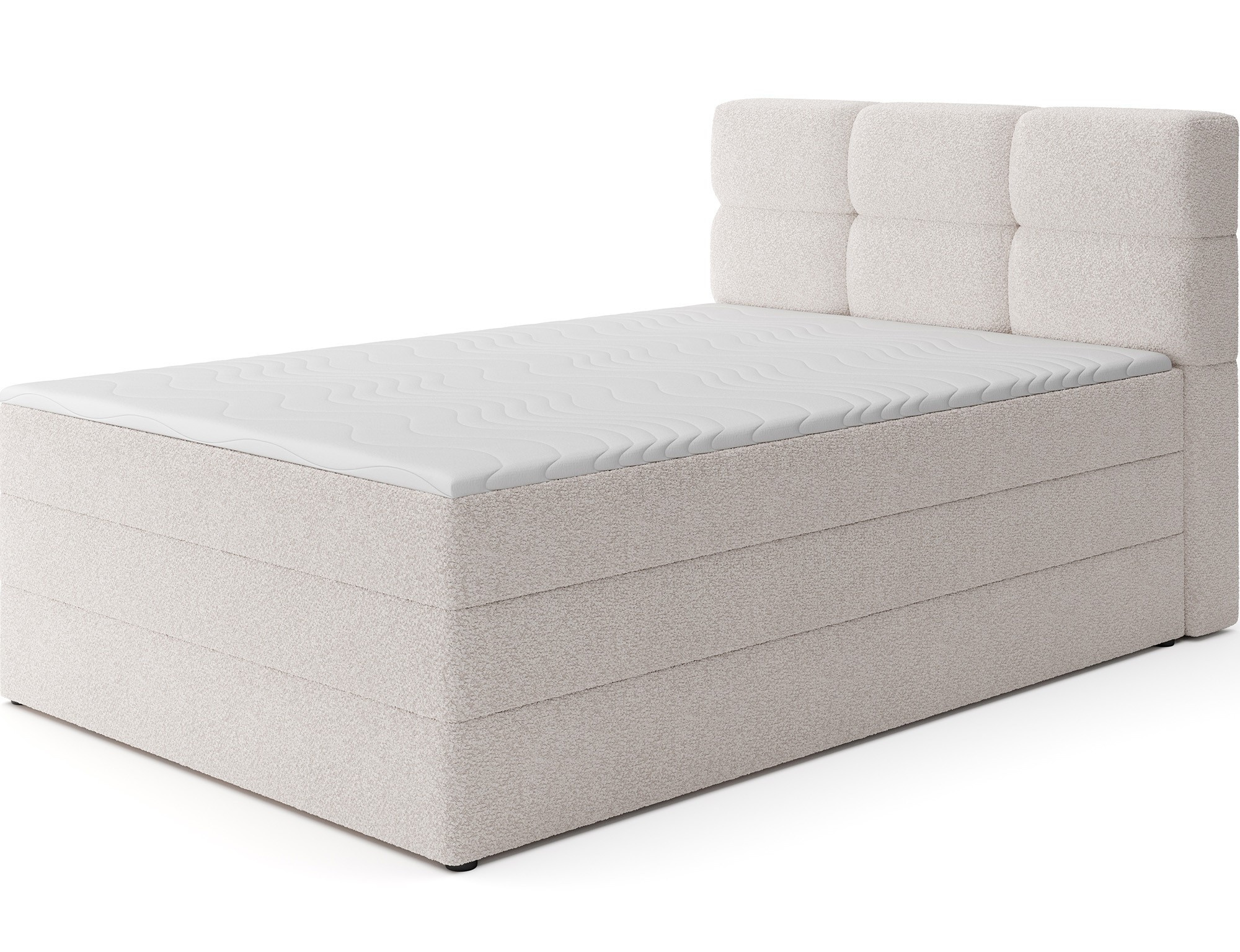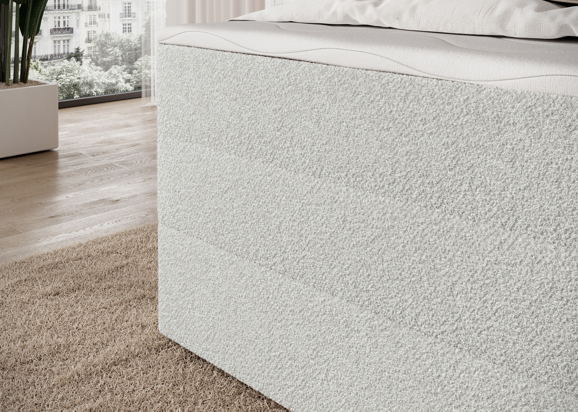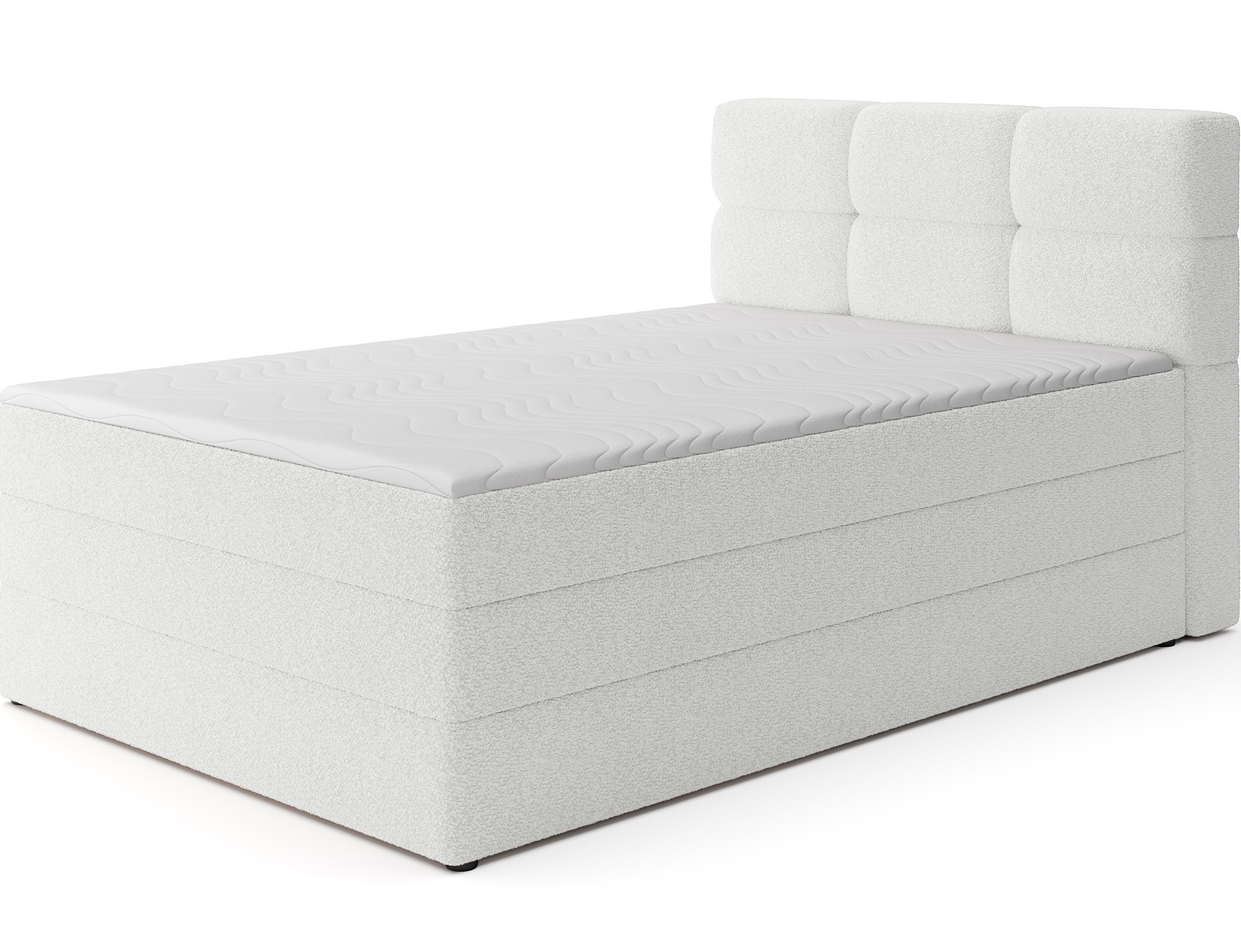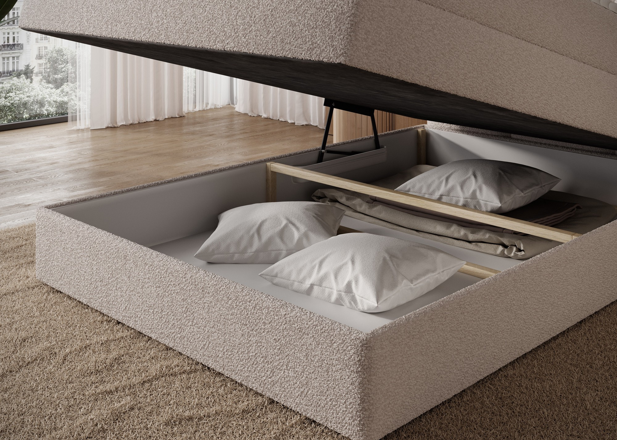 The Kasped continental bed is a modern and functional choice for any bedroom, available in two sizes: 215x121x108 cm and 215x141x108 cm, allowing it to be easily adapted to individual needs and room dimensions. The bed's construction is based on a sturdy frame made of solid wood and chipboard, ensuring long-lasting stability and durability. At the heart of the design lies a bonell spring mattress, permanently mounted onto the frame, which offers reliable body support and promotes proper air circulation for a healthy and ergonomic sleep experience. In addition, the bed features two layers of high-quality foam – foam T2130 and foam T2540 – which, in combination with the bonell spring unit, enhance flexibility, comfort, and body contour adaptation, supporting restful and regenerative sleep. The entire structure is defined by clean lines and a modern aesthetic, complemented by black furniture legs made of durable plastic, which add visual lightness while ensuring structural integrity. A highly practical feature is the built-in bedding container, providing convenient storage space for duvets, pillows, or other textiles, helping to keep the bedroom neat and organized. The Kasped bed combines premium craftsmanship, contemporary design, and everyday functionality, making it a perfect fit for both modern and more classic interior arrangements.