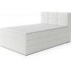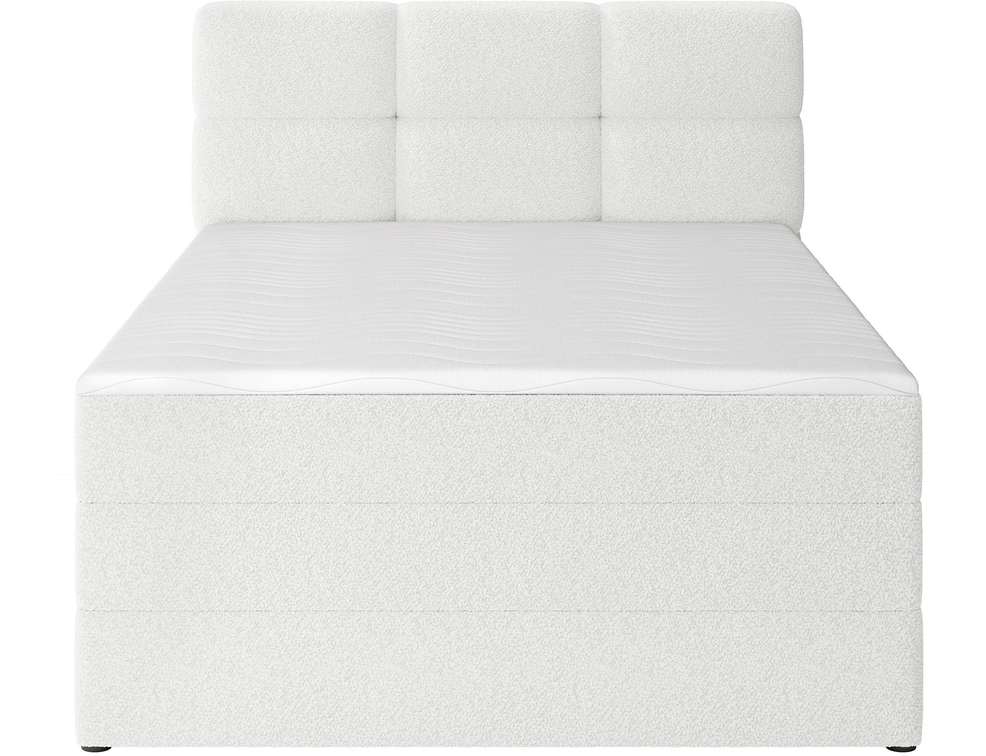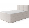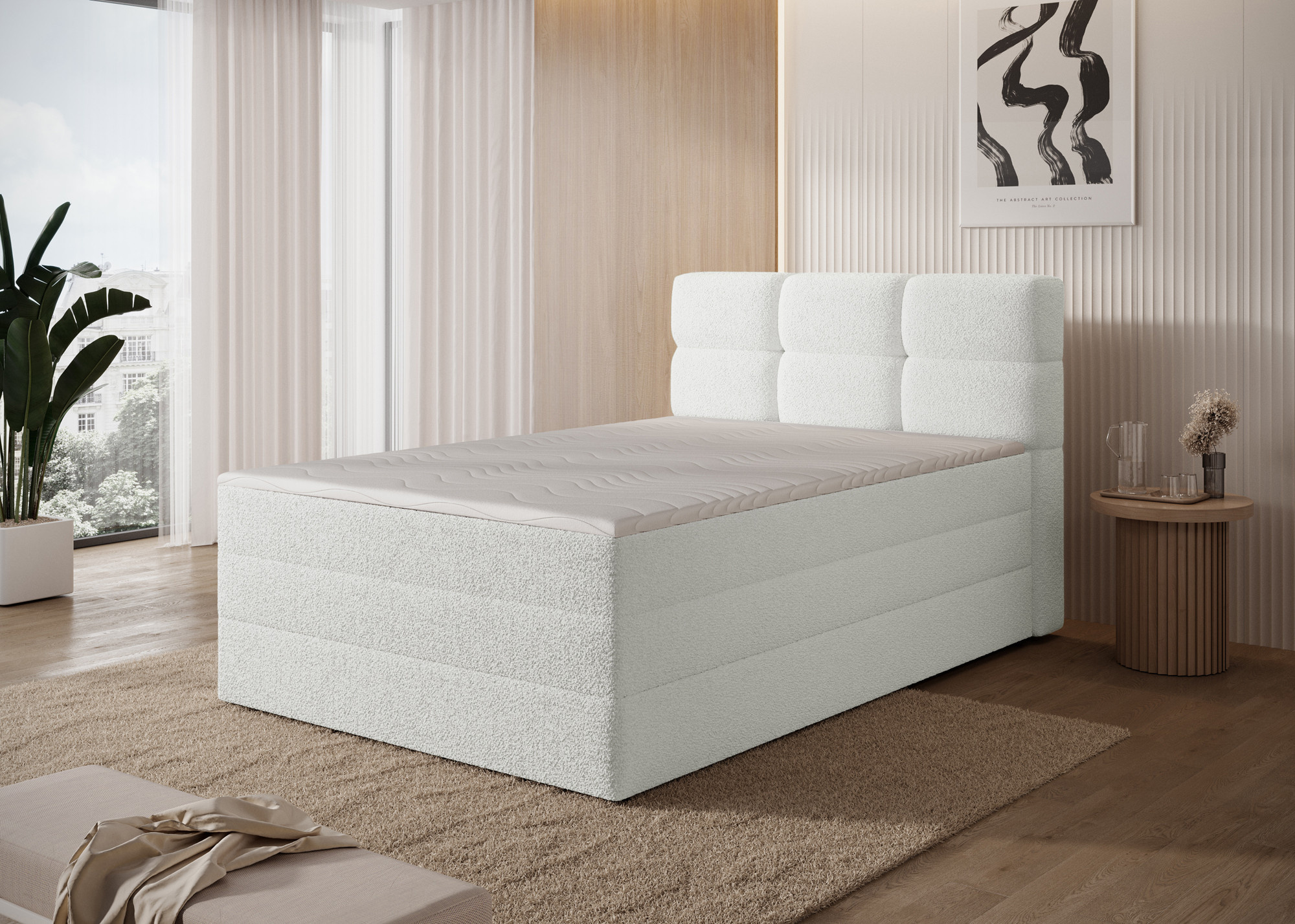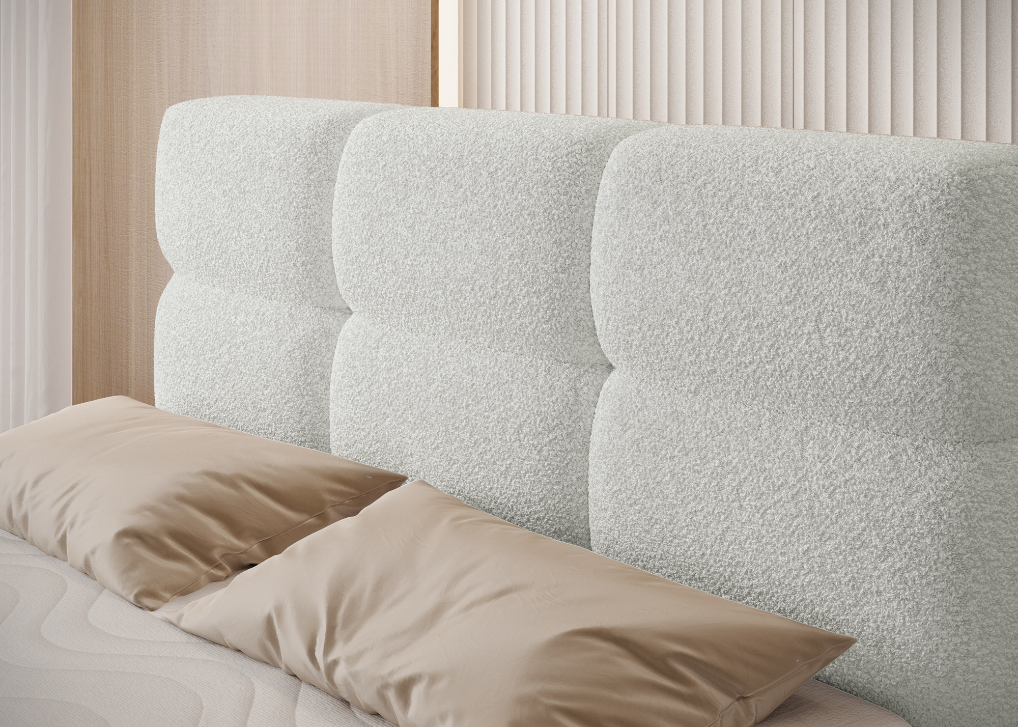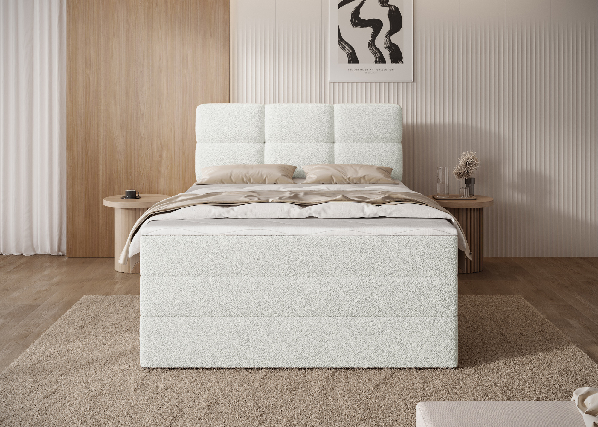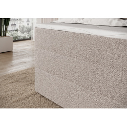The Kasped continental bed is a modern and functional choice for any bedroom, available in two sizes: 215x121x108 cm and 215x141x108 cm, allowing it to be easily adapted to individual needs and room dimensions. The bed's construction is based on a sturdy frame made of solid wood and chipboard, ensuring long-lasting stability and durability. At the heart of the design lies a bonell spring mattress, permanently mounted onto the frame, which offers reliable body support and promotes proper air circulation for a healthy and ergonomic sleep experience. In addition, the bed features two layers of high-quality foam – foam T2130 and foam T2540 – which, in combination with the bonell spring unit, enhance flexibility, comfort, and body contour adaptation, supporting restful and regenerative sleep. The entire structure is defined by clean lines and a modern aesthetic, complemented by black furniture legs made of durable plastic, which add visual lightness while ensuring structural integrity. A highly practical feature is the built-in bedding container, providing convenient storage space for duvets, pillows, or other textiles, helping to keep the bedroom neat and organized. The Kasped bed combines premium craftsmanship, contemporary design, and everyday functionality, making it a perfect fit for both modern and more classic interior arrangements.