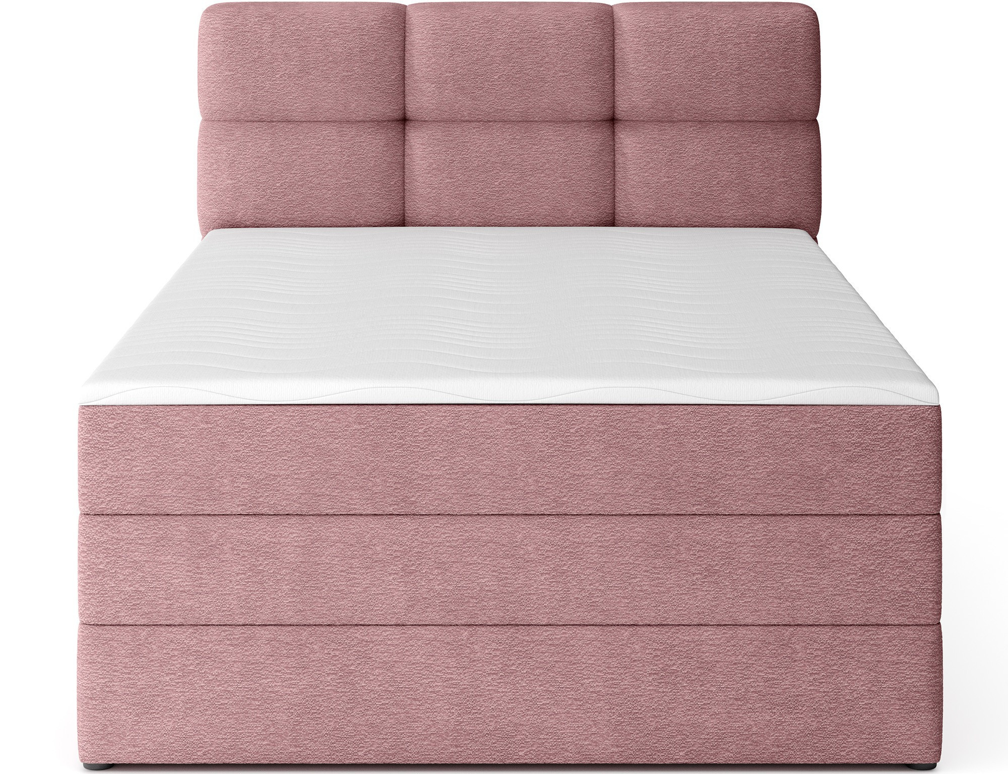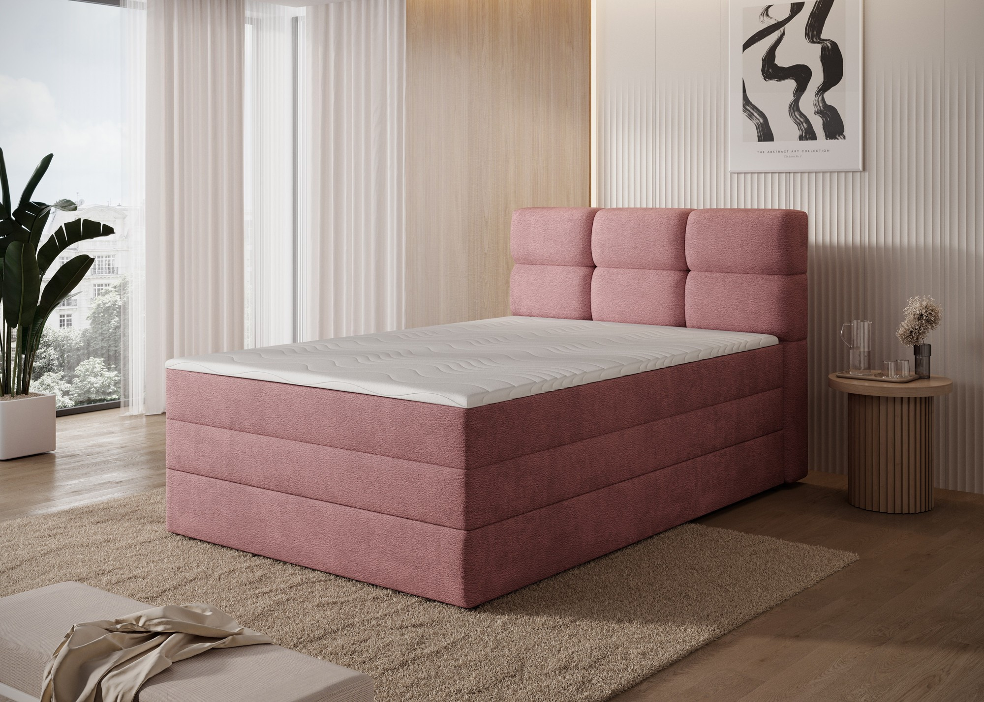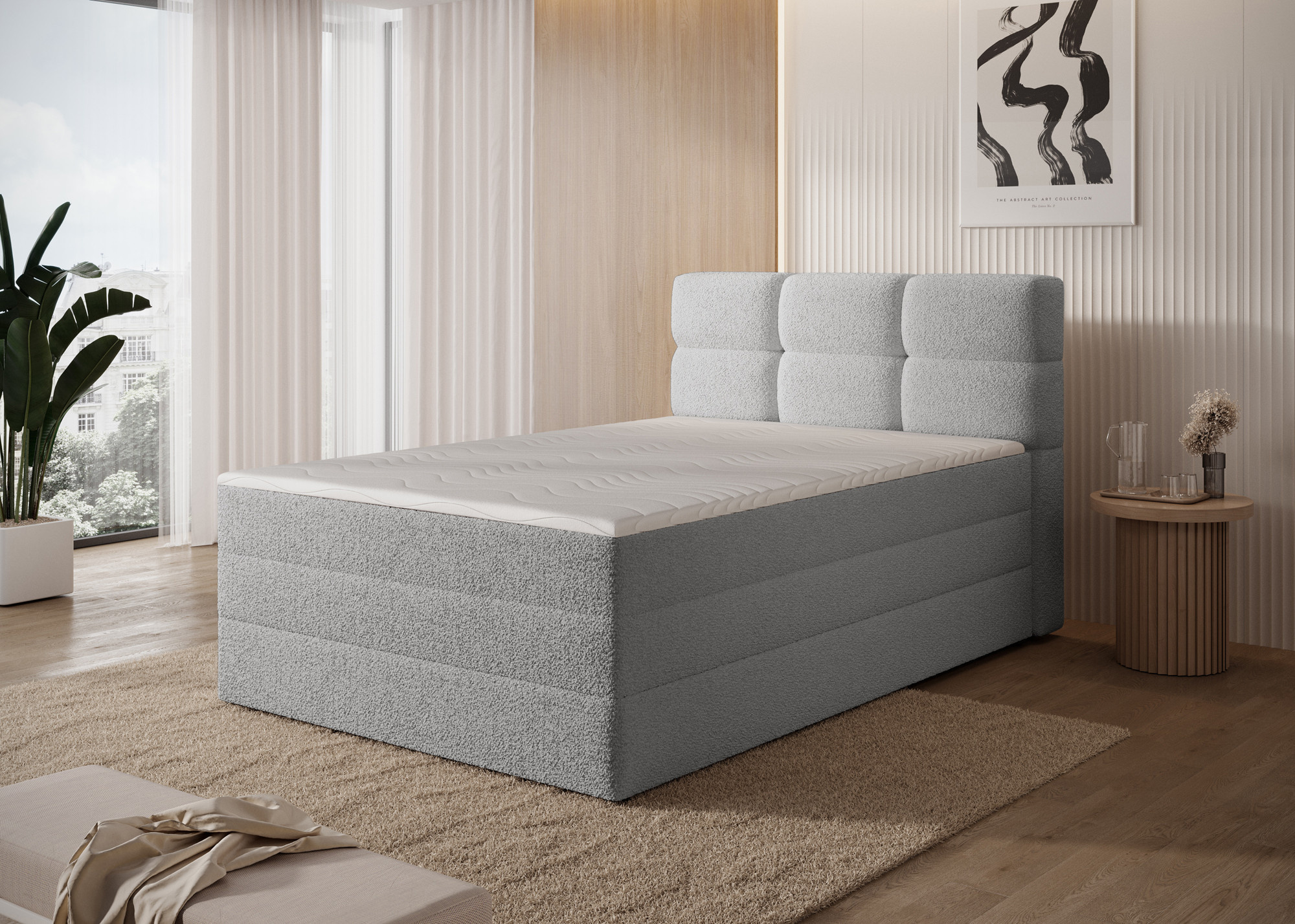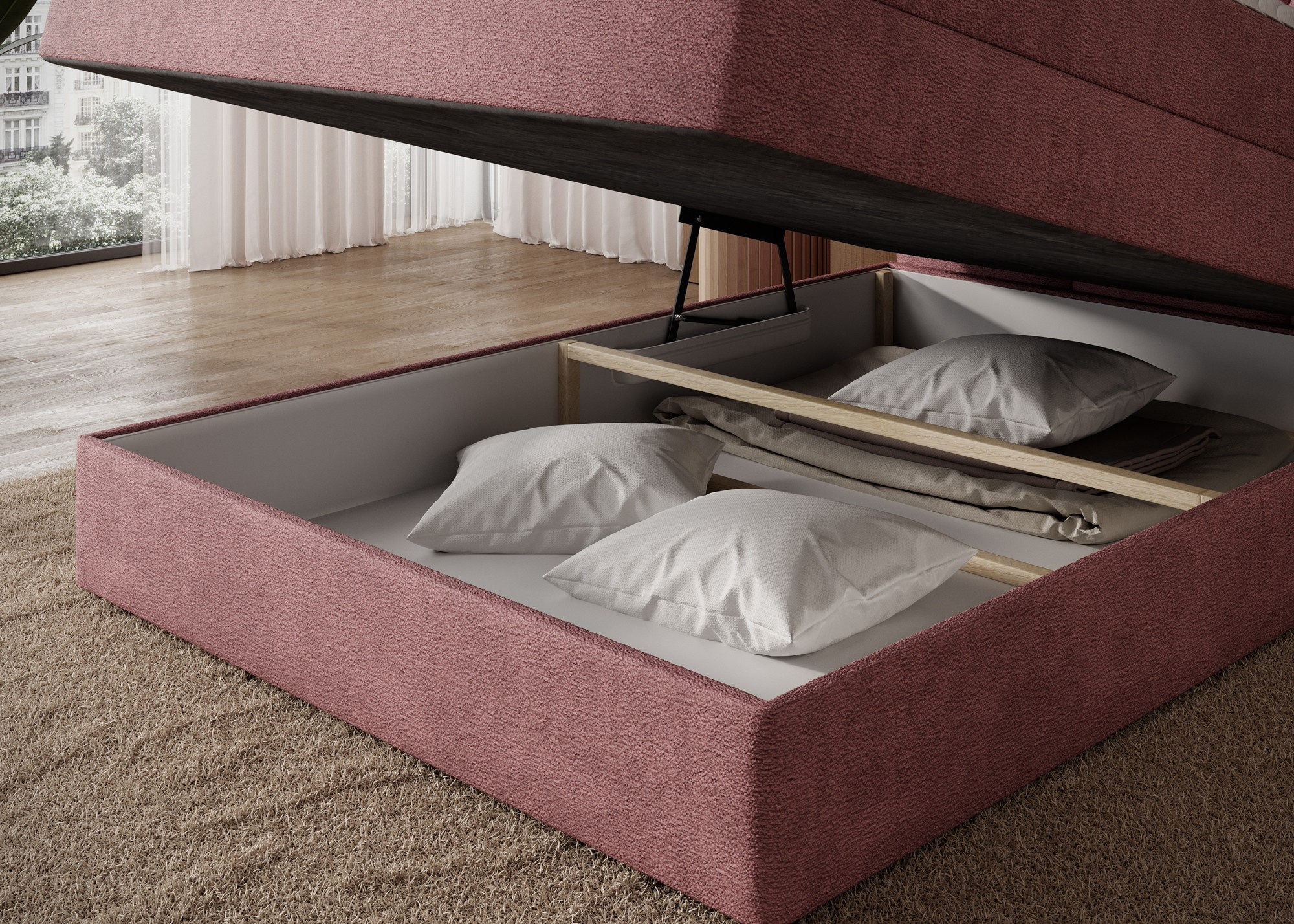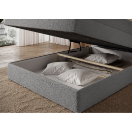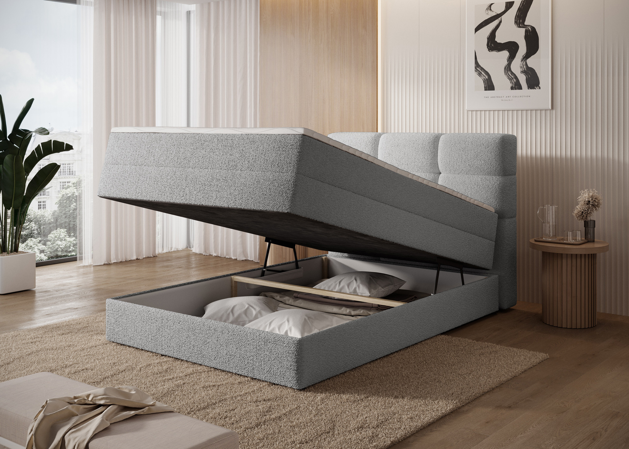 The Kasped continental bed is a modern and functional choice for any bedroom, available in two sizes: 215x121x108 cm and 215x141x108 cm, allowing it to be easily adapted to individual needs and room dimensions. The bed's construction is based on a sturdy frame made of solid wood and chipboard, ensuring long-lasting stability and durability. At the heart of the design lies a bonell spring mattress, permanently mounted onto the frame, which offers reliable body support and promotes proper air circulation for a healthy and ergonomic sleep experience. In addition, the bed features two layers of high-quality foam – foam T2130 and foam T2540 – which, in combination with the bonell spring unit, enhance flexibility, comfort, and body contour adaptation, supporting restful and regenerative sleep. The entire structure is defined by clean lines and a modern aesthetic, complemented by black furniture legs made of durable plastic, which add visual lightness while ensuring structural integrity. A highly practical feature is the built-in bedding container, providing convenient storage space for duvets, pillows, or other textiles, helping to keep the bedroom neat and organized. The Kasped bed combines premium craftsmanship, contemporary design, and everyday functionality, making it a perfect fit for both modern and more classic interior arrangements.