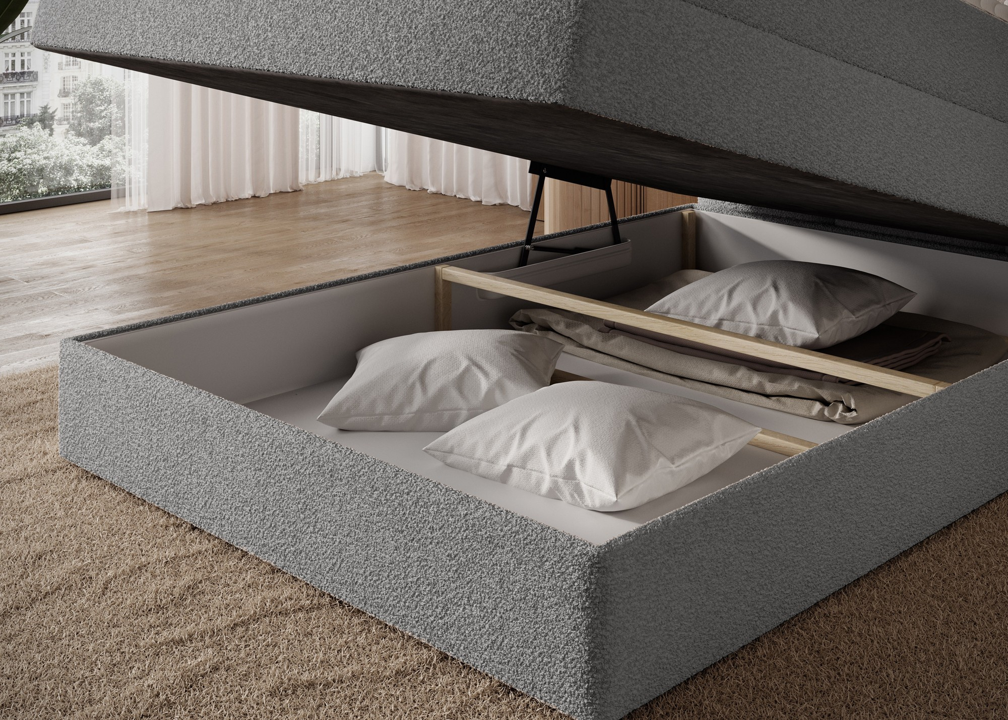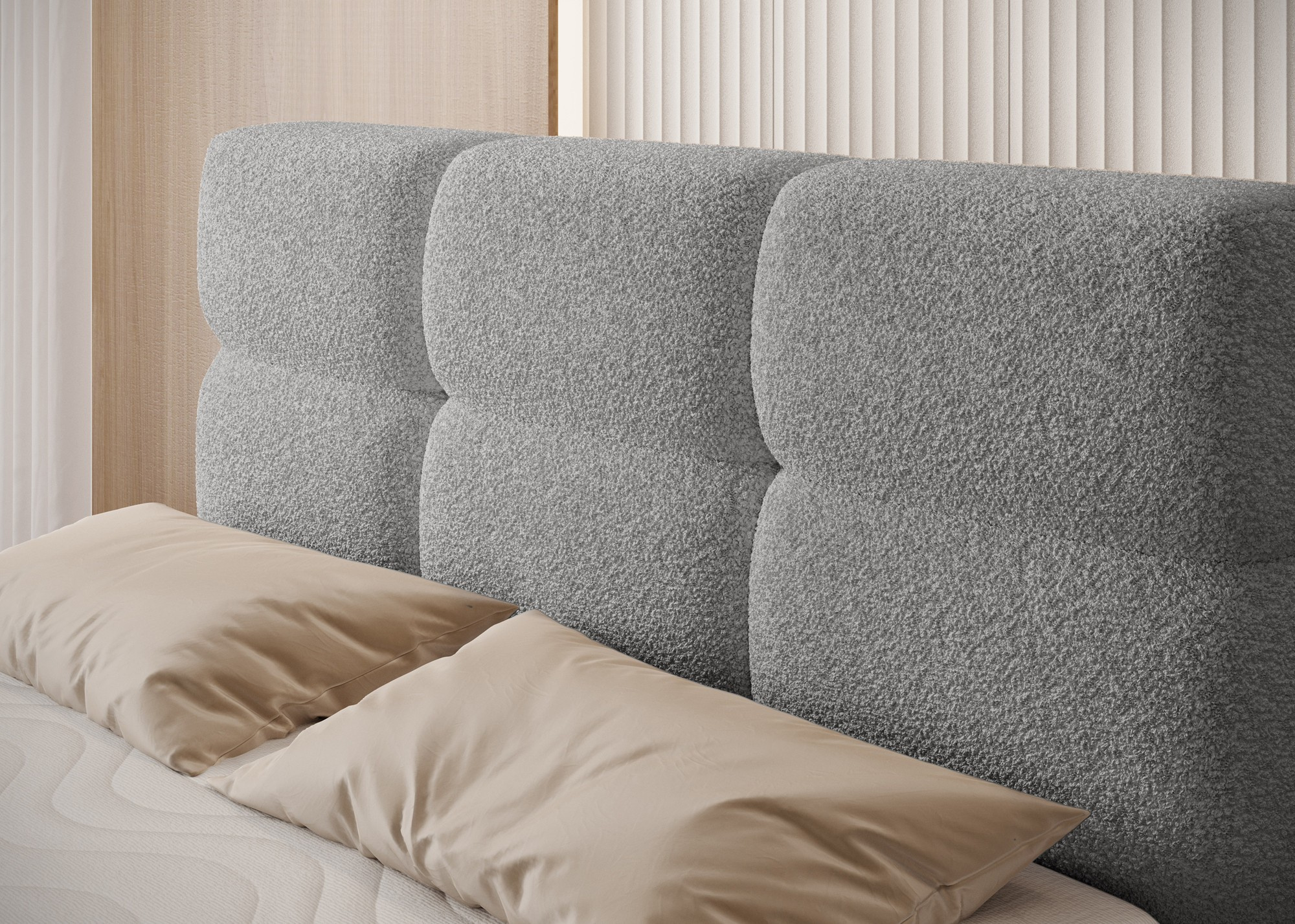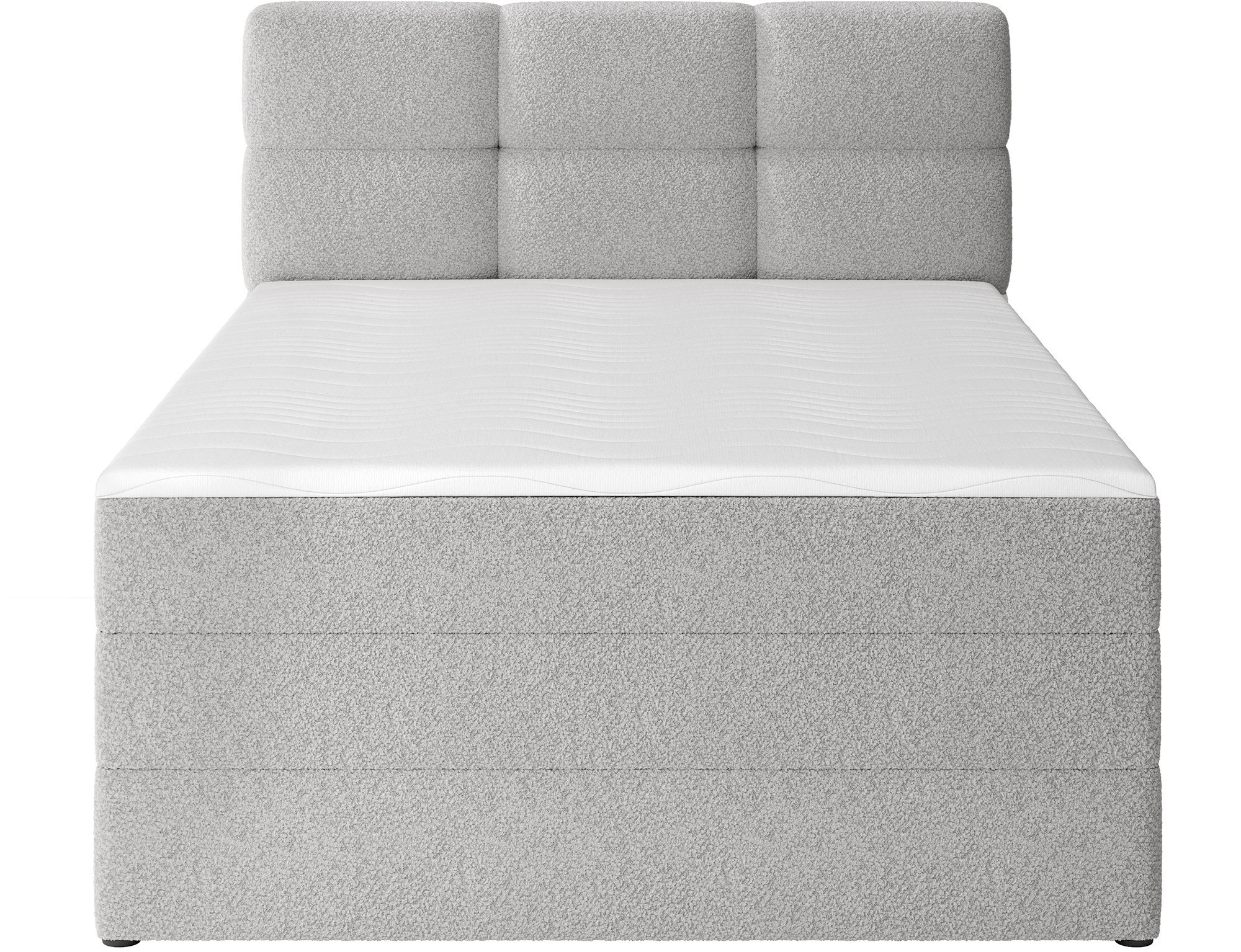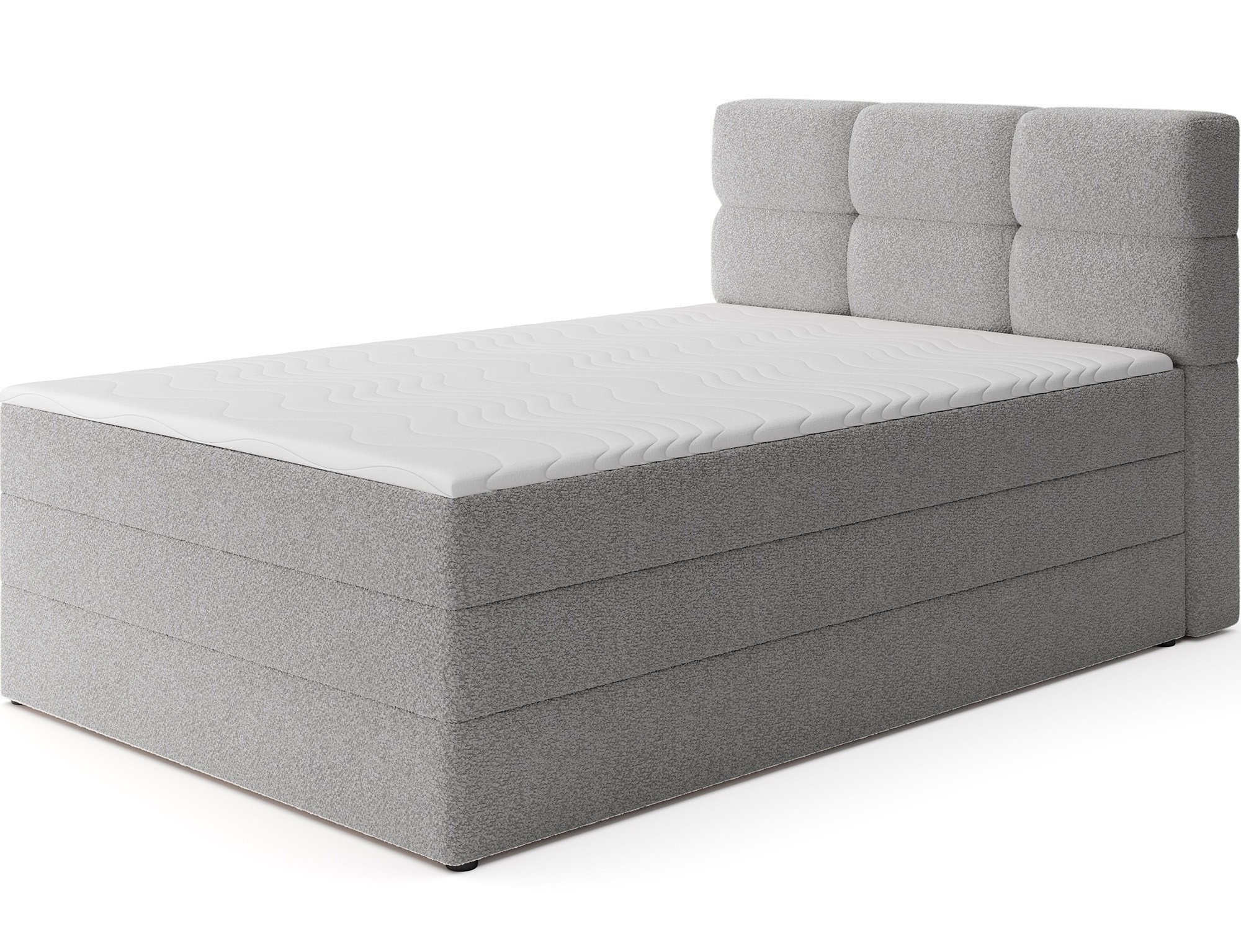 The Kasped continental bed is a modern and functional choice for any bedroom, available in two sizes: 215x121x108 cm and 215x141x108 cm, allowing it to be easily adapted to individual needs and room dimensions. The bed's construction is based on a sturdy frame made of solid wood and chipboard, ensuring long-lasting stability and durability. At the heart of the design lies a bonell spring mattress, permanently mounted onto the frame, which offers reliable body support and promotes proper air circulation for a healthy and ergonomic sleep experience. In addition, the bed features two layers of high-quality foam – foam T2130 and foam T2540 – which, in combination with the bonell spring unit, enhance flexibility, comfort, and body contour adaptation, supporting restful and regenerative sleep. The entire structure is defined by clean lines and a modern aesthetic, complemented by black furniture legs made of durable plastic, which add visual lightness while ensuring structural integrity. A highly practical feature is the built-in bedding container, providing convenient storage space for duvets, pillows, or other textiles, helping to keep the bedroom neat and organized. The Kasped bed combines premium craftsmanship, contemporary design, and everyday functionality, making it a perfect fit for both modern and more classic interior arrangements.