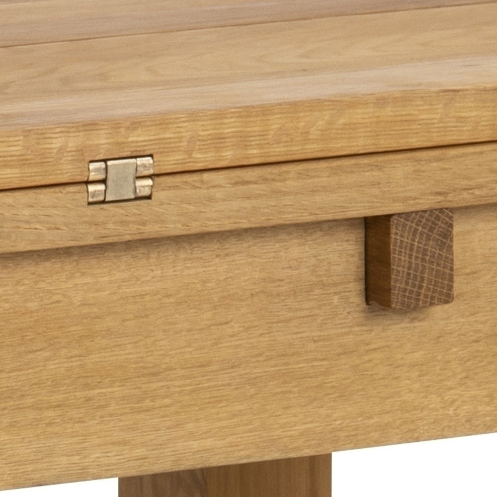 Kenley asztal a nem mindennapi kihúzható asztallapjának köszönhetően nagyon funkcionális és ideális kis helyiségekbe. Az asztal tölgy furnérból készült. További, az asztalhoz rögzített deszkák fixen vannak rögzítve zsanérokkal. Az asztal nagyon könnyen szétszerelhető, csak nyissa ki a lapokat kifelé, hogy nagyobb asztalfelületet élvezhessen. Az asztal olajozva lett, ennek köszönhetően nagyon szépen mutatja a fát, amelyből készült. Tömeg: 33 kg. Kartondoboz méretei: 26cm x 111cm x 55cm