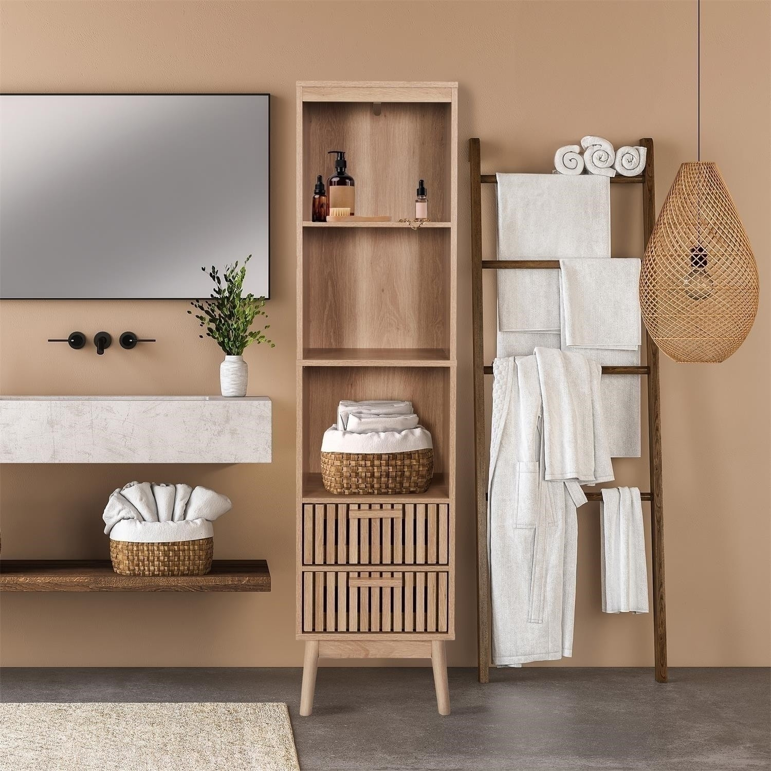 A Klaus oszlop 2 fiókkal ideális megoldás azok számára, akik értékelik a praktikusságot és a stílust. Kompakt méreteinek és átgondolt kialakításának köszönhetően kiválóan alkalmas mind kis, mind nagyobb helyiségekbe, további tárolóhelyet biztosít anélkül, hogy értékes helyet foglalna el. Modern kialakítása és magas minőségű kidolgozása biztosítja, hogy ne csak funkcionális, hanem dekoratív eleme is legyen otthonának. Világos, természetes fa kivitel, amely melegséget és otthonosságot kölcsönöz minden helyiségnek. Két nyitott polc és két fiók elegendő helyet biztosít különböző tárgyak tárolására, a könyvektől a dekorációkig. Egyszerű, de elegáns design függőleges barázdákkal a fiókok elején, amelyek karaktert és modernséget kölcsönöznek. A stabil lábak biztosítják a szerkezet szilárdságát, ugyanakkor könnyedséget kölcsönöznek a bútornak. A termék hossza: 40 cm A termék magassága: 160 cm A termék mélysége: 30 cm A termék súlya: 19600 g