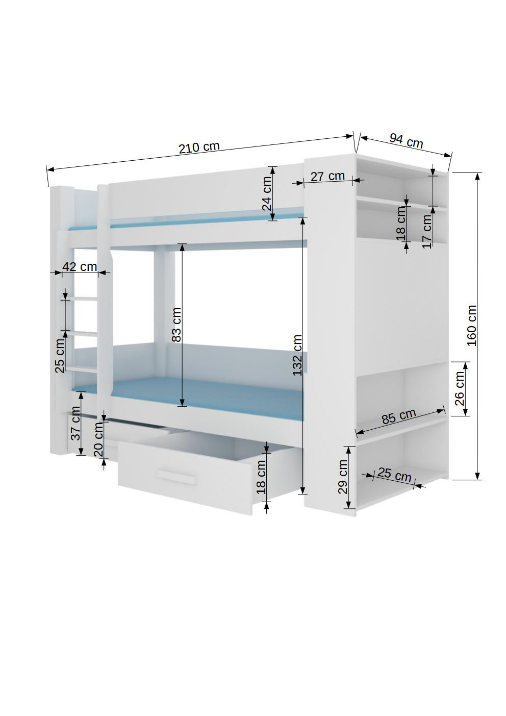 A GARET emeletes, 2 ágyas ágy nagyszerű ötlet a helytakarékosságra egy kis gyerekszobában. A bútor tartalmaz egy lépcsős létrát és két tágas és funkcionális fiókot az ágynemű számára. Ezenkívül két szinten korlátokat szereltek fel, amelyek növelik a biztonságot alvás közben. A GARET modell polcai az ágy belső és külső oldalán is elhelyezkednek. A matracok nem tartoznak az ágyhoz.