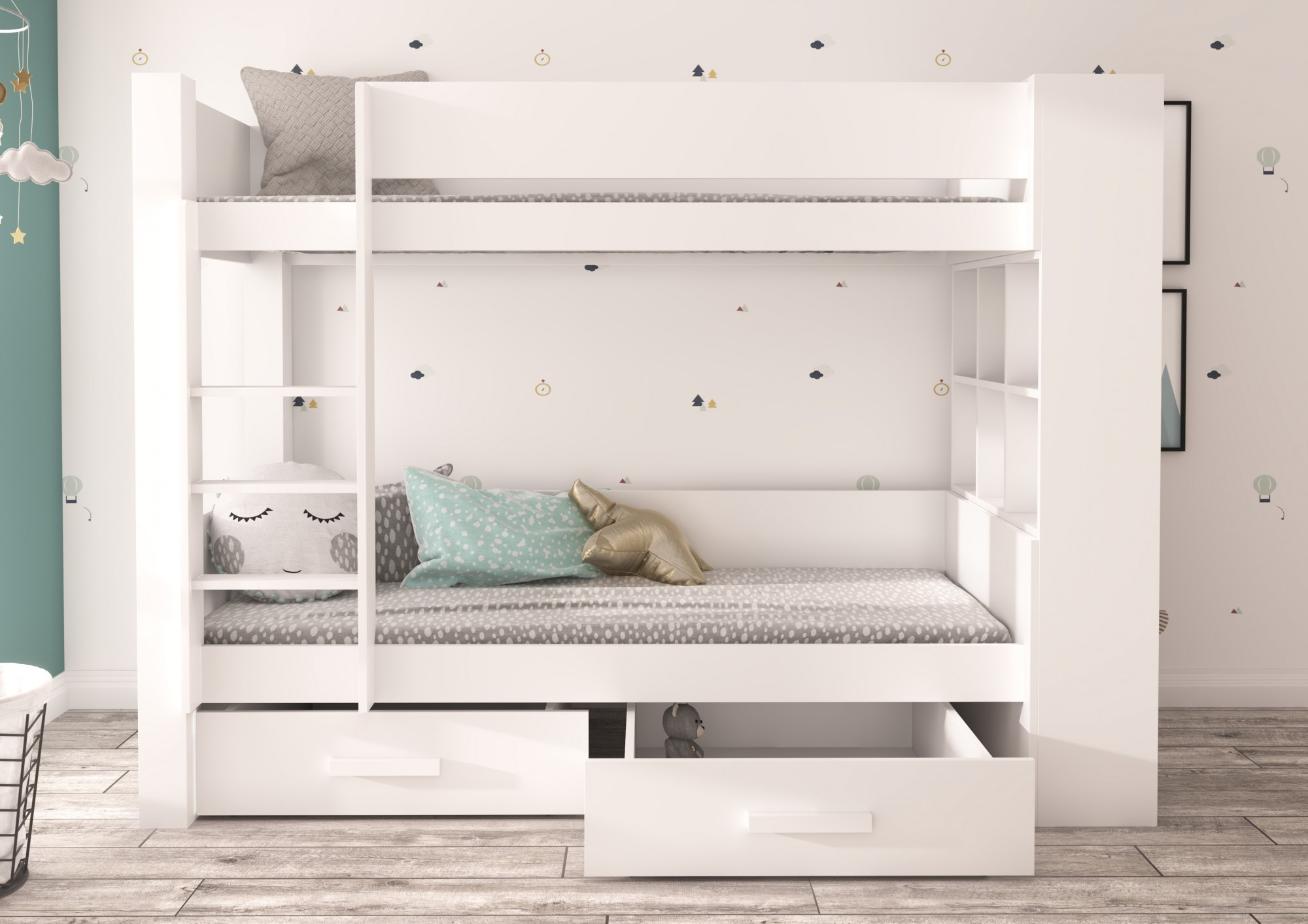 A GARET emeletes, 2 ágyas ágy nagyszerű ötlet a helytakarékosságra egy kis gyerekszobában. A bútor tartalmaz egy lépcsős létrát és két tágas és funkcionális fiókot az ágynemű számára. Ezenkívül két szinten korlátokat szereltek fel, amelyek növelik a biztonságot alvás közben. A GARET modell polcai az ágy belső és külső oldalán is elhelyezkednek. A készlet része két darab 8 cm vastag habszivacs matrac.