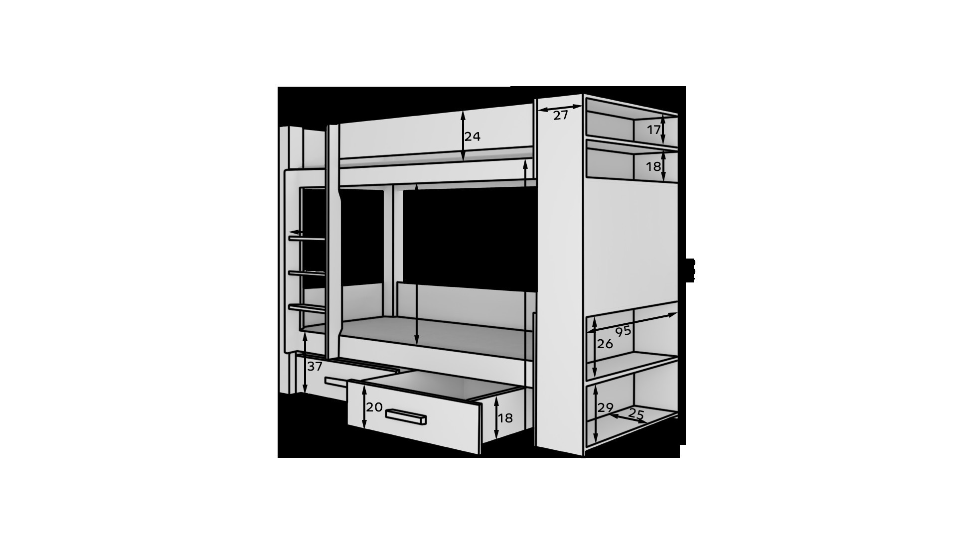 A GARET emeletes, 2 ágyas ágy nagyszerű ötlet a helytakarékosságra egy kis gyerekszobában. A bútor tartalmaz egy lépcsős létrát és két tágas és funkcionális fiókot az ágynemű számára. Ezenkívül két szinten korlátokat szereltek fel, amelyek növelik a biztonságot alvás közben. A GARET modell polcai az ágy belső és külső oldalán is elhelyezkednek. A készlet része két darab 8 cm vastag habszivacs matrac.