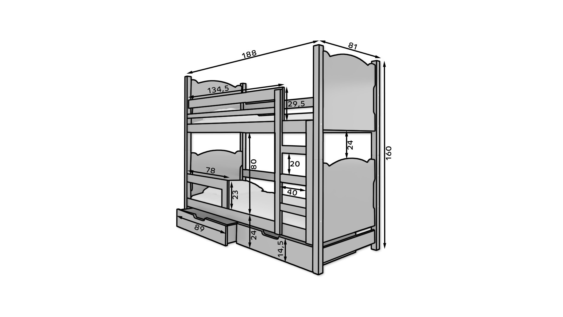 A MARABA emeletes, 2 személyes ágy nagyszerű ötlet a helytakarékosságra egy kis gyerekszobában. A bútor tartalmaz egy lépcsős létrát és két tágas és funkcionális fiókot az ágynemű számára. Ezenkívül két szinten korlátokat szereltek fel, amelyek növelik a biztonságot alvás közben. Az ággyal együtt kap egy szett habszivacs matracot pamut huzattal, cipzárral.