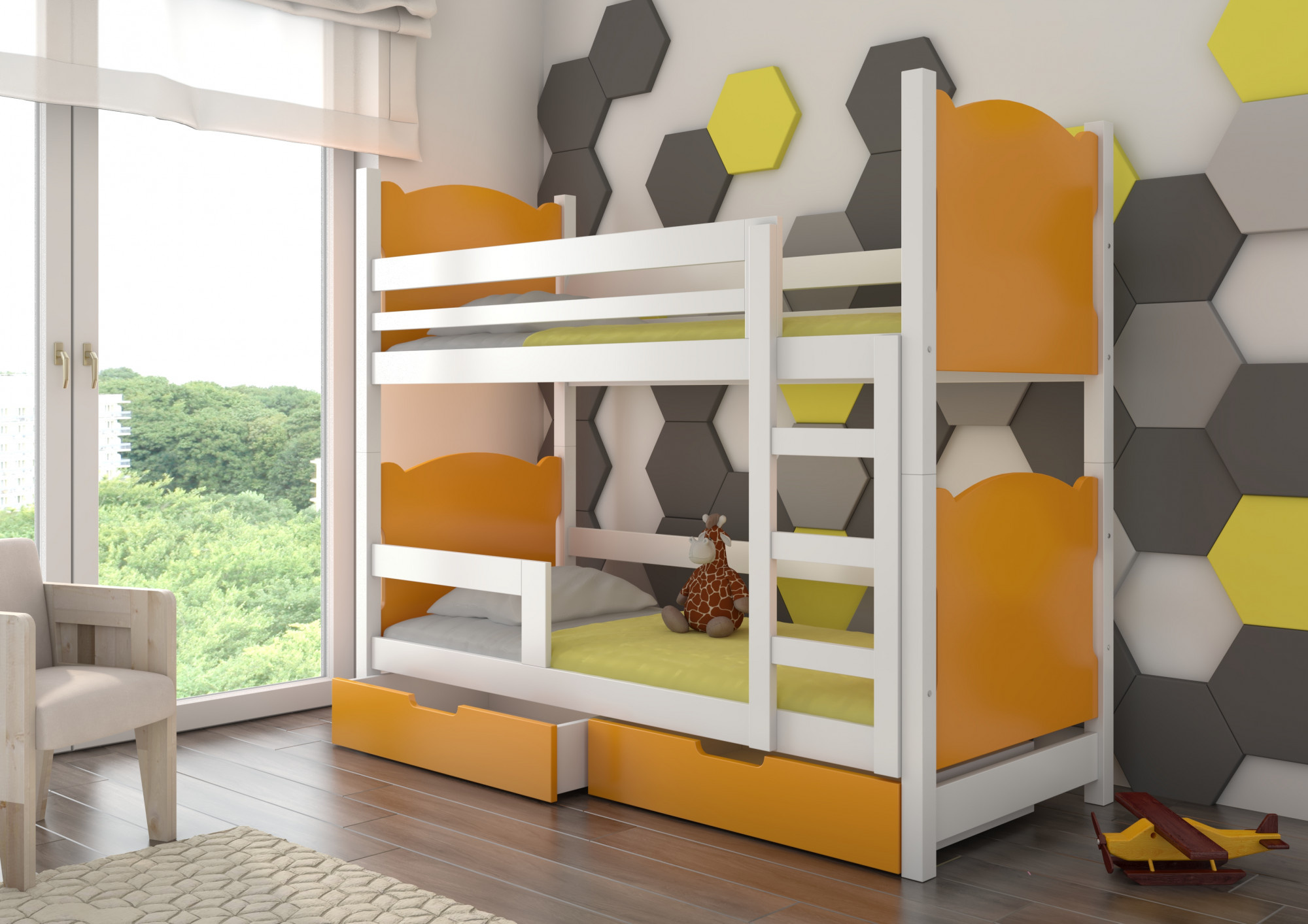 A MARABA emeletes, 2 személyes ágy nagyszerű ötlet a helytakarékosságra egy kis gyerekszobában. A bútor tartalmaz egy lépcsős létrát és két tágas és funkcionális fiókot az ágynemű számára. Ezenkívül két szinten korlátokat szereltek fel, amelyek növelik a biztonságot alvás közben. Az ággyal együtt kap egy szett habszivacs matracot pamut huzattal, cipzárral.