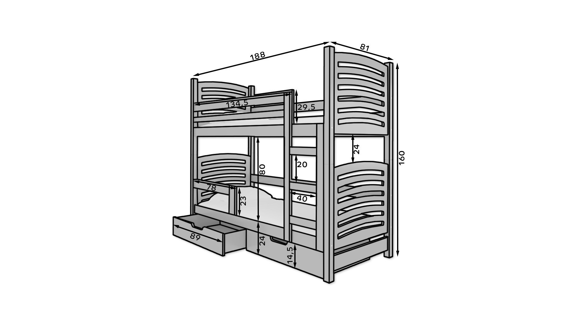 Az OSUNA emeletes 2 személyes ágy nagyszerű ötlet a helytakarékosságra egy kis gyerekszobában. A bútor tartalmaz egy lépcsős létrát és két tágas és funkcionális fiókot az ágynemű számára. Ezenkívül két szinten korlátokat szereltek fel, amelyek növelik a biztonságot alvás közben. Az ággyal együtt kap egy szett habszivacs matracot pamut huzattal, cipzárral.