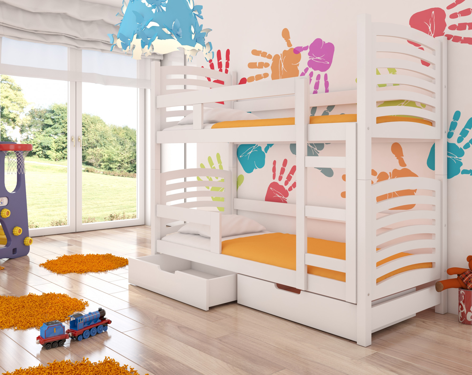 Az OSUNA emeletes 2 személyes ágy nagyszerű ötlet a helytakarékosságra egy kis gyerekszobában. A bútor tartalmaz egy lépcsős létrát és két tágas és funkcionális fiókot az ágynemű számára. Ezenkívül két szinten korlátokat szereltek fel, amelyek növelik a biztonságot alvás közben. Az ággyal együtt kap egy szett habszivacs matracot pamut huzattal, cipzárral.