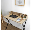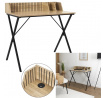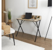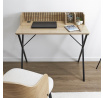 A Klaus íróasztal ideális bútordarab egy tinédzser szobájába vagy otthoni irodába. A Klaus kollekció íróasztala lamellás díszítésekkel rendelkezik, amelyek ideálisan kontrasztálnak az asztal fekete alapjával. A bútor forgácslapból készült, amelyet a fa természetes évgyűrűit utánzó furnérral díszítettek. Az asztal alapja nagyon tartós fém, amely fekete porfestékkel van bevonva. Matt talapzat és fa színű lap illik mind a modern, mind a loft stílusú belső terekhez. A tábla magassága: 75 cm. Az asztal összeszerelést igényel. Max. a lemez terhelése 20 kg. Az asztal tömege 11,8 kg. Kartondoboz méretei: 93x8x52 cm