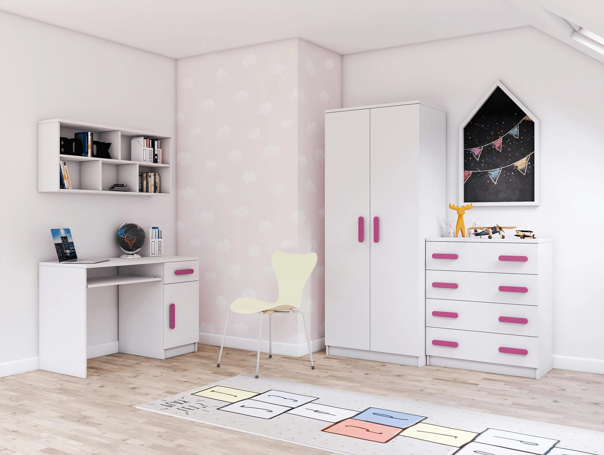 A SMYK I modern bútorcsalád egyszerűségével és eleganciájával örvendeztet meg, amely a korpusz és a frontok klasszikus fehér színét ötvözi. A "Smyk I" másik jellemzője a díszes fa fogantyúk, amelyek különböző színekben kaphatók. Éppen ezek adják a bútornak a karakterét, és teremtenek egyedi és finom légkört a gyerekszobában.