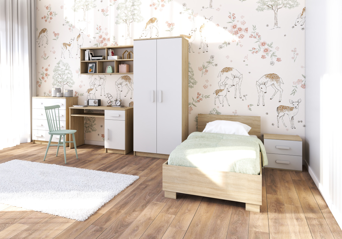 A SMYK III modern bútorcsalád egyszerűségével és eleganciájával örvendeztet meg, amely a korpusz Sonoma Tölgy színét és a fehér frontokat kombinálja. A "Smyk III" másik megkülönböztető eleme a díszes fa fogantyúk, amelyek különböző színekben kaphatók. Éppen ezek adják a bútornak a karakterét, és teremtenek egyedi és finom légkört a gyerekszobában.
