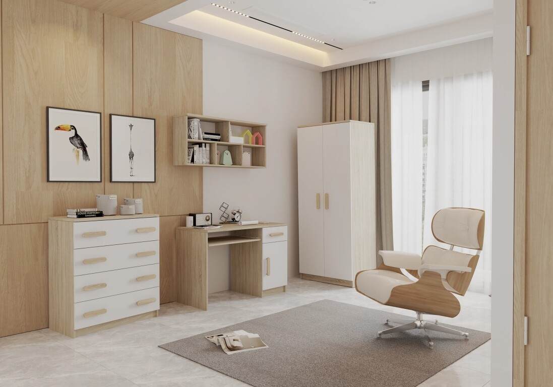 A SMYK III modern bútorcsalád egyszerűségével és eleganciájával örvendeztet meg, amely a korpusz Sonoma Tölgy színét és a fehér frontokat kombinálja. A "Smyk III" másik megkülönböztető eleme a díszes fa fogantyúk, amelyek különböző színekben kaphatók. Éppen ezek adják a bútornak a karakterét, és teremtenek egyedi és finom légkört a gyerekszobában.