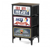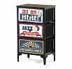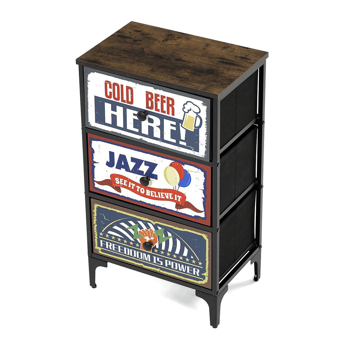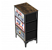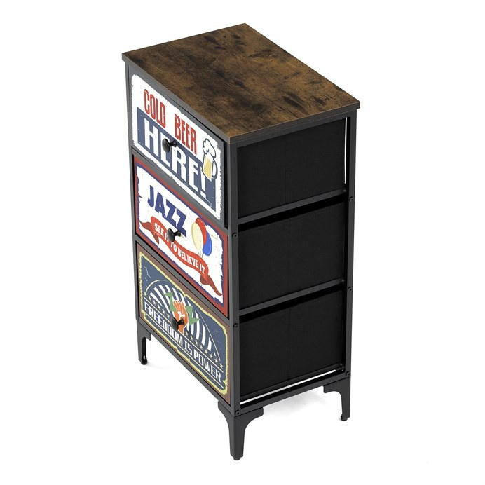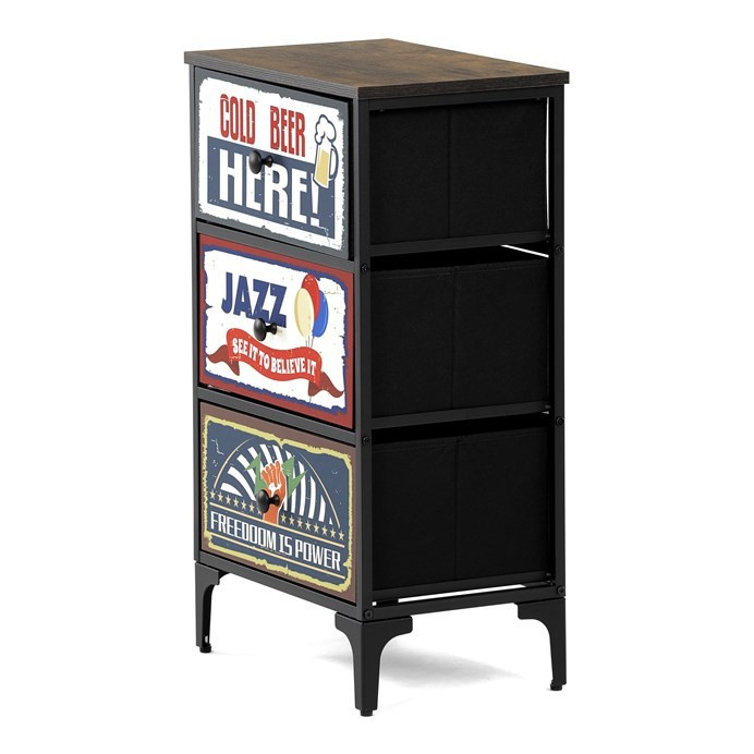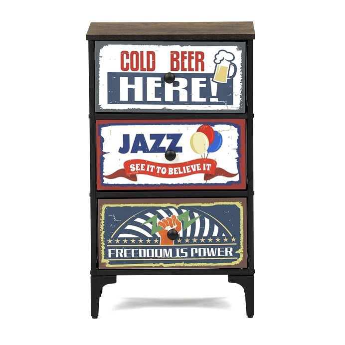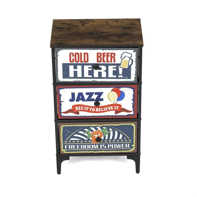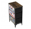 Retro komoda značky Autronic přinese do vašeho interiéru jedinečný styl a originalitu. Textilní čela zásuvek s výplní HDF a vintage potiskem navozují atmosféru starých amerických barů a jazzových klubů. Kombinace černé kovové konstrukce, desky v dekoru starého dřeva a zdobných noh dodává nábytku robustní, ale zároveň elegantní vzhled. Korpus zásuvek je vyroben z netkané textilie s výplní HDF, což zajišťuje jejich lehkost a snadnou manipulaci. Ideální doplněk do obývacího pokoje nebo stylové kavárny, kde se stane nepřehlédnutelným prvkem.
