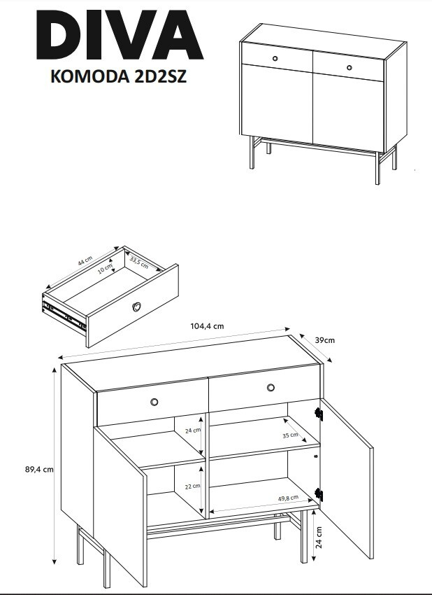 Nechejte se okouzlit kvalitou a stylem komody DIVA 2D2SZ. Tento nábytek je dokonalým spojením funkčnosti a designu, který oživí každý interiér. Udělejte si radost a pořiďte si tento skvělý kousek do své domácnosti.
