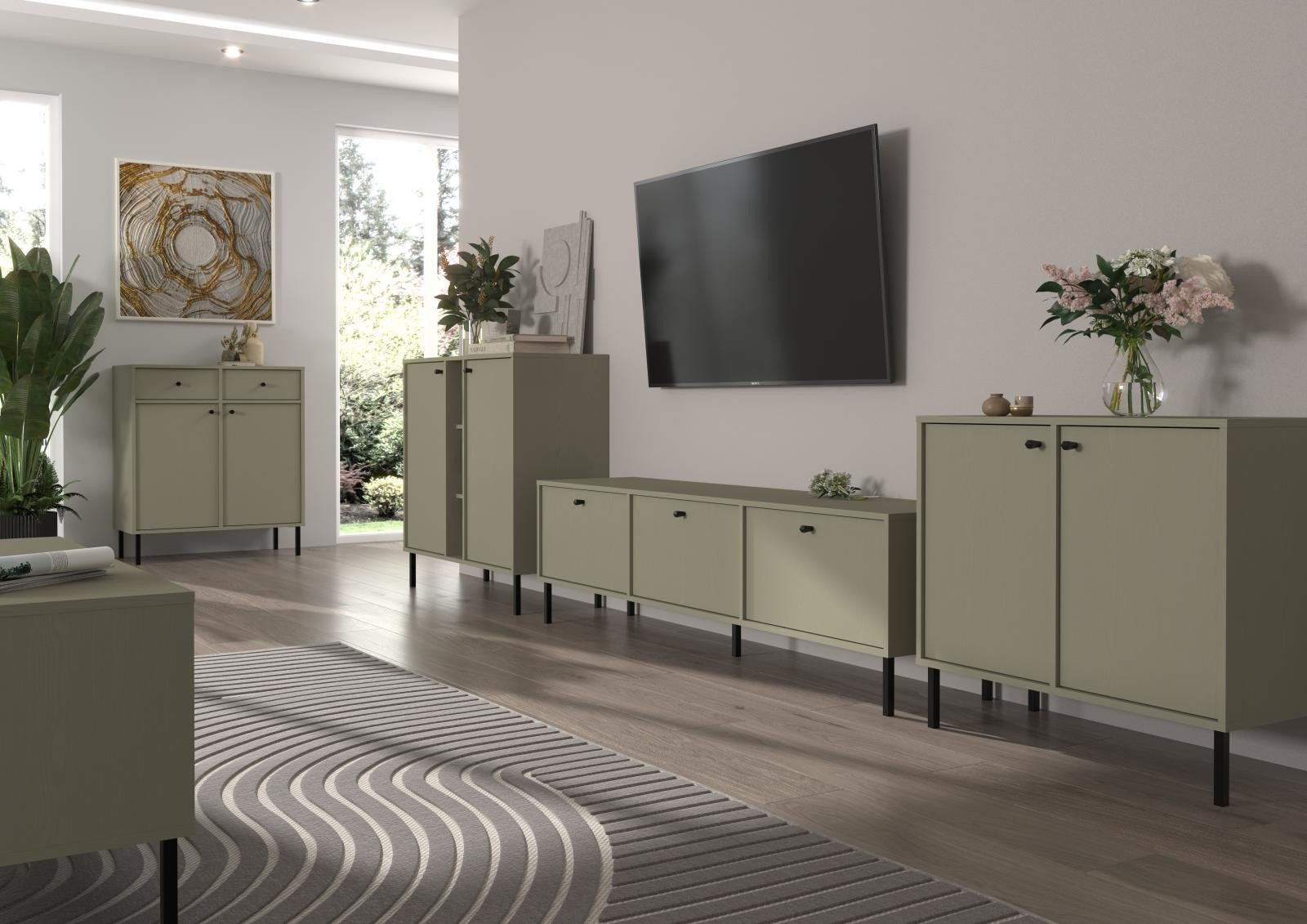 Série Tomila nabízí noční, TV i konferenční stolky, vitríny a komody v široké škále tvarů, barev a typů noh.