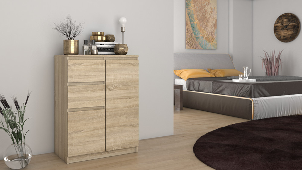 Funkční a prostorná komoda Topa v nadčasovém elegantním designu ozdobí každý prostor vašeho domu či bytu. Pohodlná bezúchytková čela zásuvek a dvířka podtrhnou moderní charakter interiéru. Komoda je vyrobená z kvalitního 16 mm lamina, hrany jsou zakončené vysoce odolným ABS materiálem.