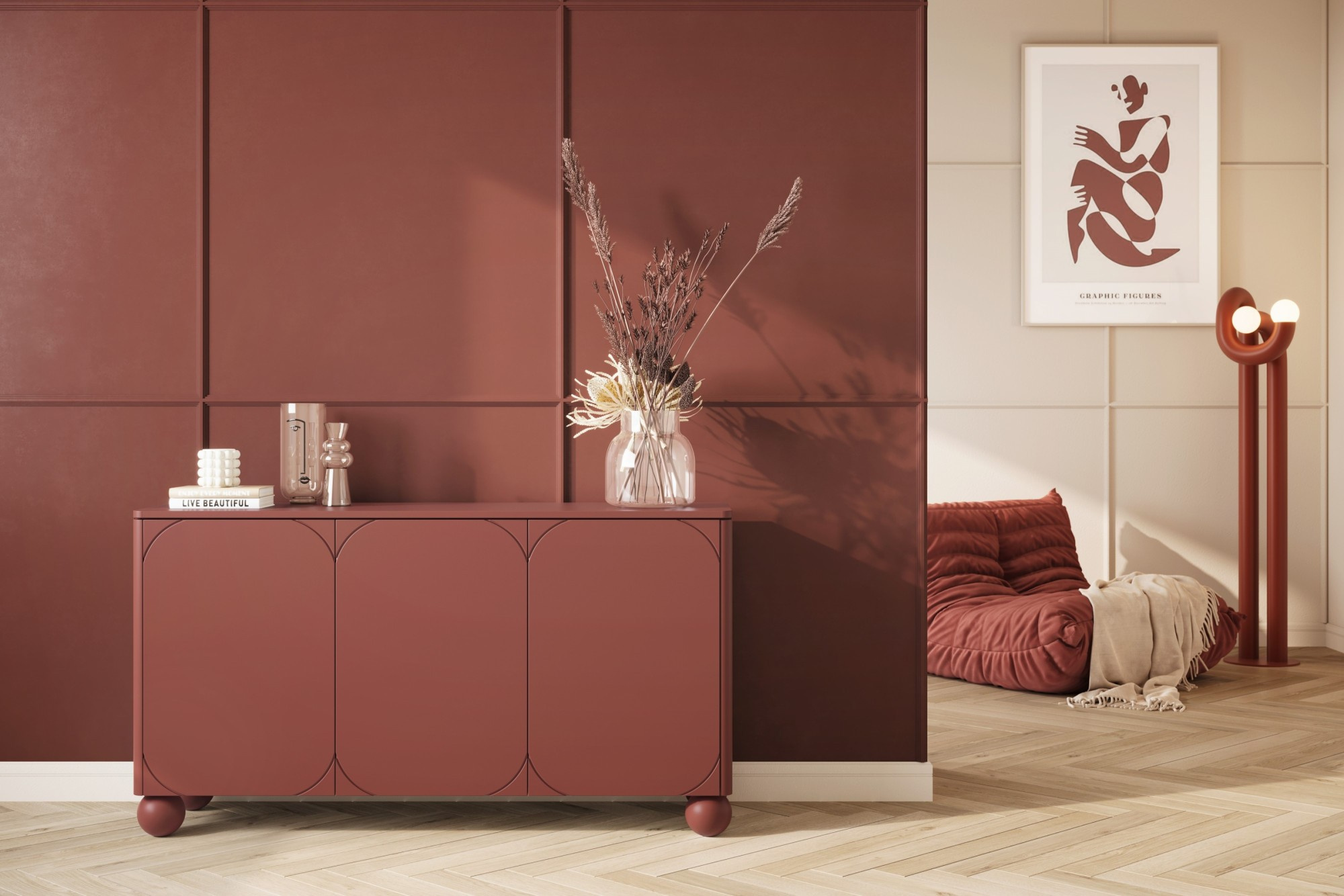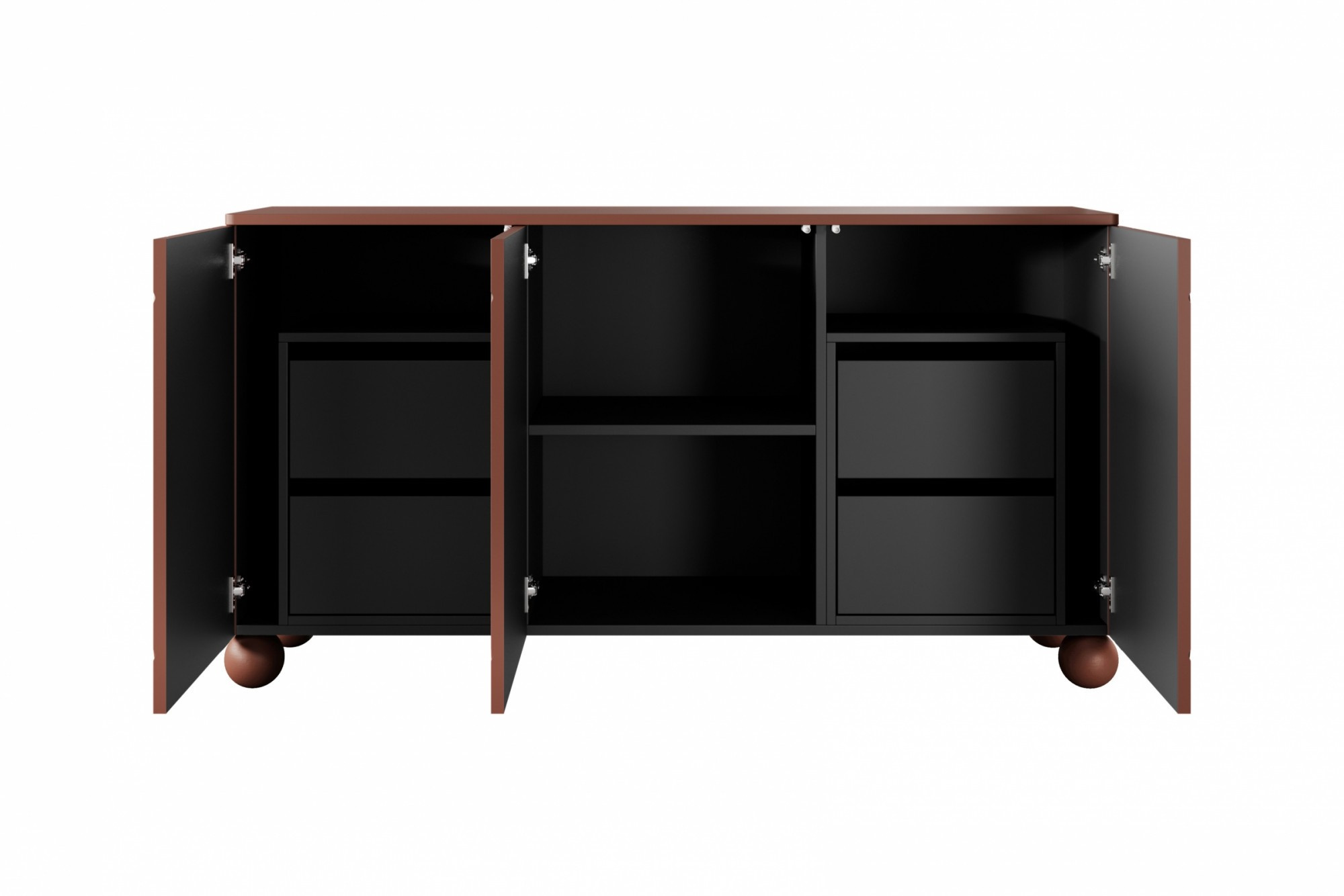Komoda trzydrzwiowa z czterema ukrytymi szufladami Sonatia II 150 cm - burgund, Szerokość: 150, Wysokość: 82, Głębokość: 45, Wysokość nóżek: 12, Montaż: