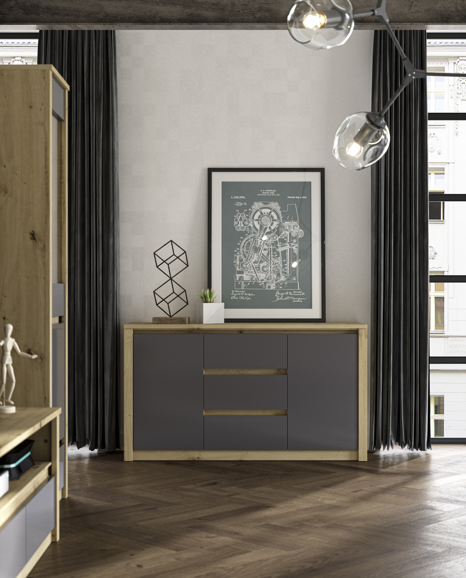 A MALTA bútor laminált anyagból készült, Artisan tölgy kombinációjával fehér vagy szürke ajtókkal.