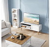 TV stolek o šířce 120 cm je vyroben z MDF desky v bílé barvě, která se snadno udržuje a nabízí hladký povrch. Stabilní nohy z masivního kaučukového dřeva dodávají stolku pevnost a přírodní vzhled, který kontrastuje s moderním bílým korpusem. Stolek disponuje praktickým úložným prostorem rozděleným na dvě otevřené police a jednu uzavíratelnou skříňku, což umožňuje efektivní organizaci elektroniky i doplňků. Otevřená část je vybavena průchodkou pro kabeláž, která usnadňuje zapojení zařízení. Kompaktní rozměry a čistý design činí tento konferenční stolek vhodným doplňkem do moderních obývacích pokojů.