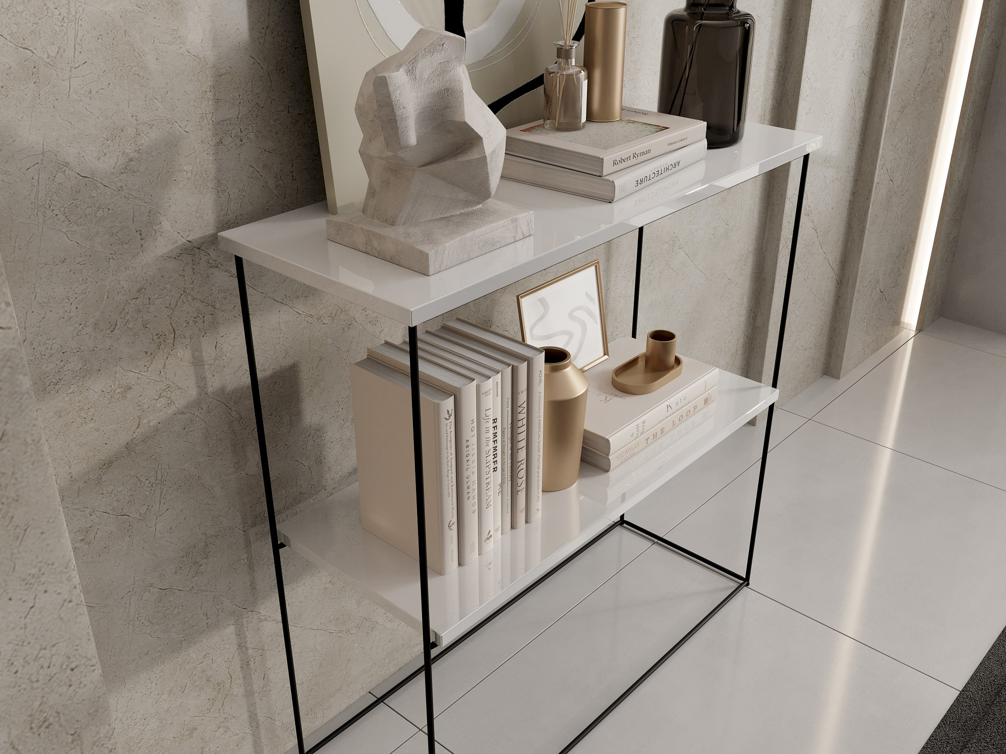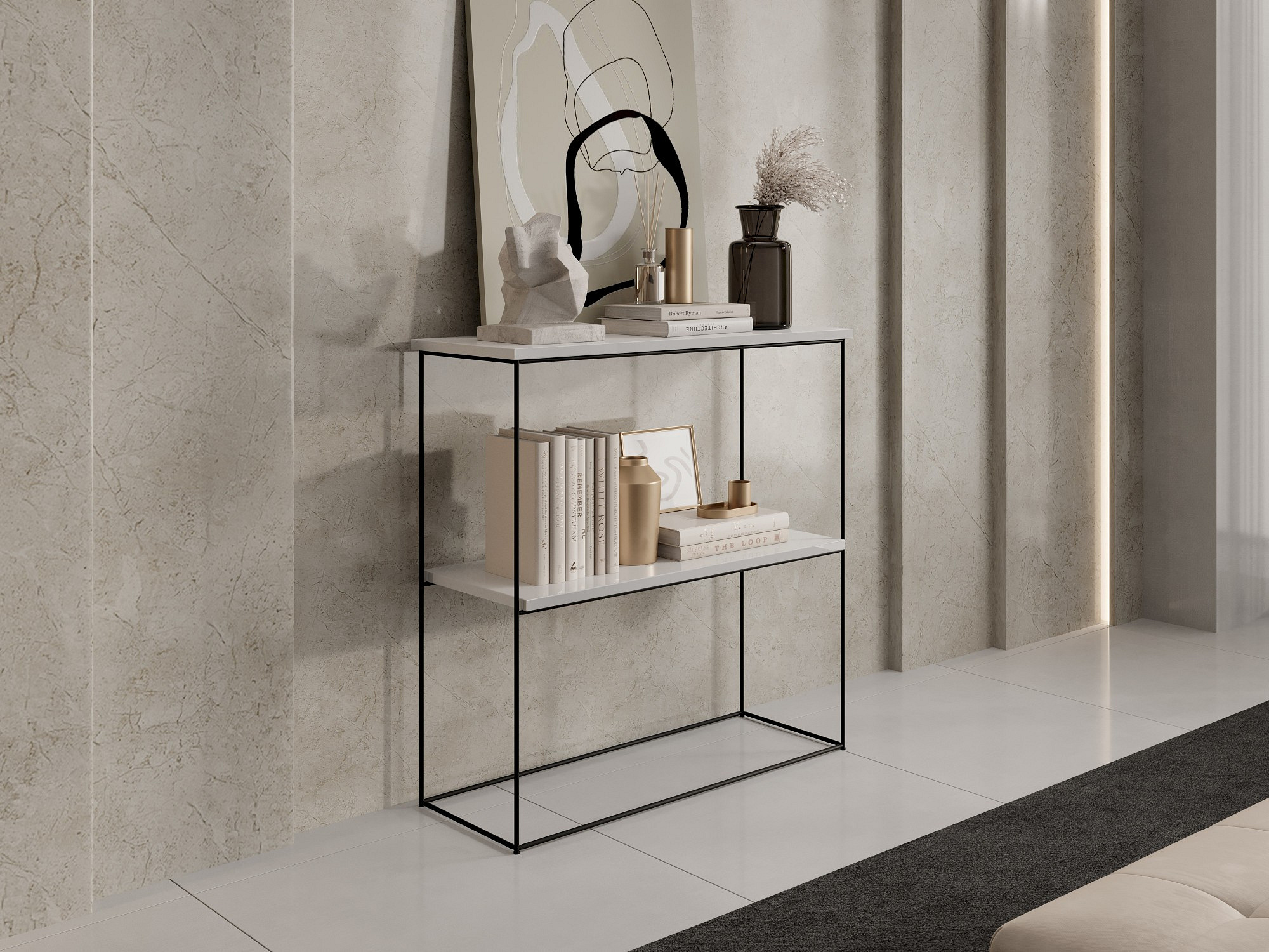 A Toni konzolasztal elegáns és modern bútordarab, amely tökéletesen illeszkedik a különböző belső terekbe, a minimalista stílustól a több eklektikusig. A konzol jellegzetes eleme a huzalból készült láb, amely könnyedséget és modern megjelenést kölcsönöz neki. A sár egyszerű formája ideálisan harmonizál a fém alap finom alakjával, harmonikus egészet alkotva.