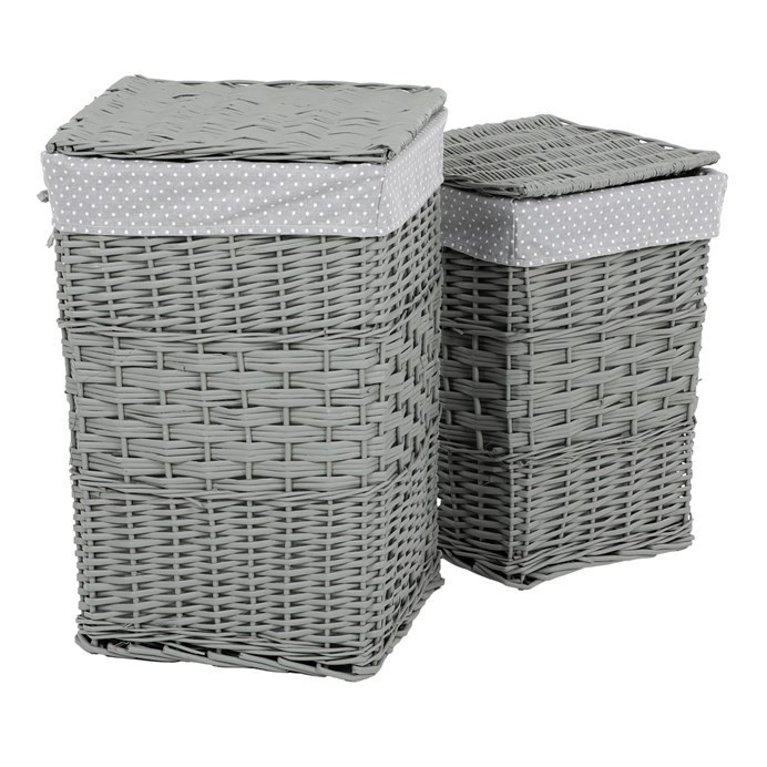 Myslíte si, že obyčejný koš na prádlo nemůže být zároveň i vkusnou dekorací? Pak jste na omylu, neboť naše proutěné v šedé barvě splňují naprosto dokonale funkci praktickou i estetickou. Jejich elegantní design a použití přírodního materiálu činí z těchto košů neodolatelný prostředek pro efektivní uskladňování špinavého prádla. Jsou vystlané látkou a mají sklápěcí víko, díky kterému jejich obsah dokonale schováte. Nabízíme je v sadě dvou kusů stejného stylu a odlišných rozměrů.