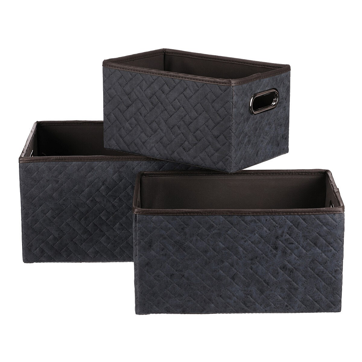 Sada tří látkových košů o obdélníkových tvarech s koženkovými povrchy se postará o pořádek stylově a s přehledem. V elegantní modré barvě, s praktickými úchyty po stranách ve tvaru oválných otvorů, se skvěle hodí do regálů, skříní i polic. Různé velikosti umožní systematicky uspořádat drobnosti, oblečení nebo potřeby pro domácnost. Zkrátka všechno, co nechcete hledat každé ráno, a to od ponožek až po kabelky, budete mít pěkně na svém místě a vy už budete hned vědět, kam sáhnout.