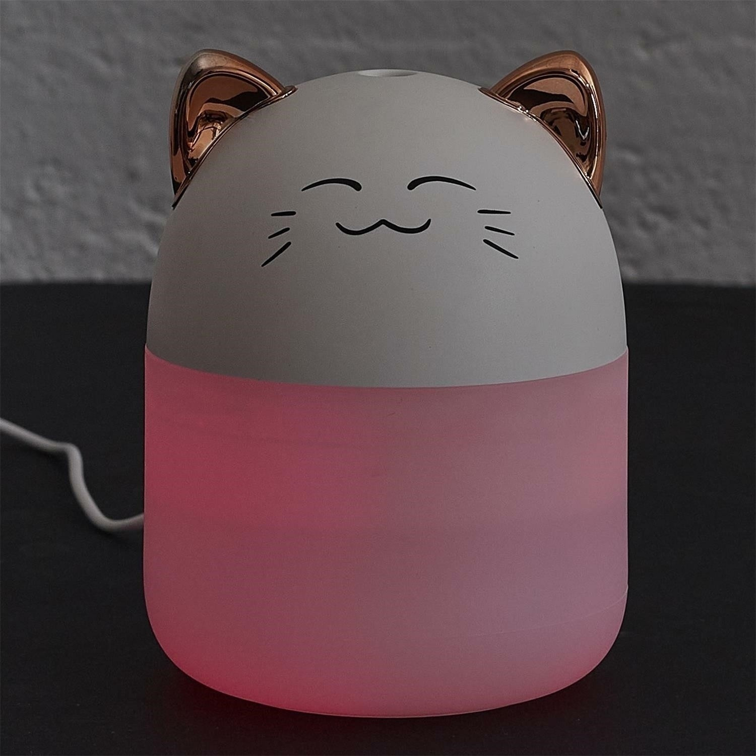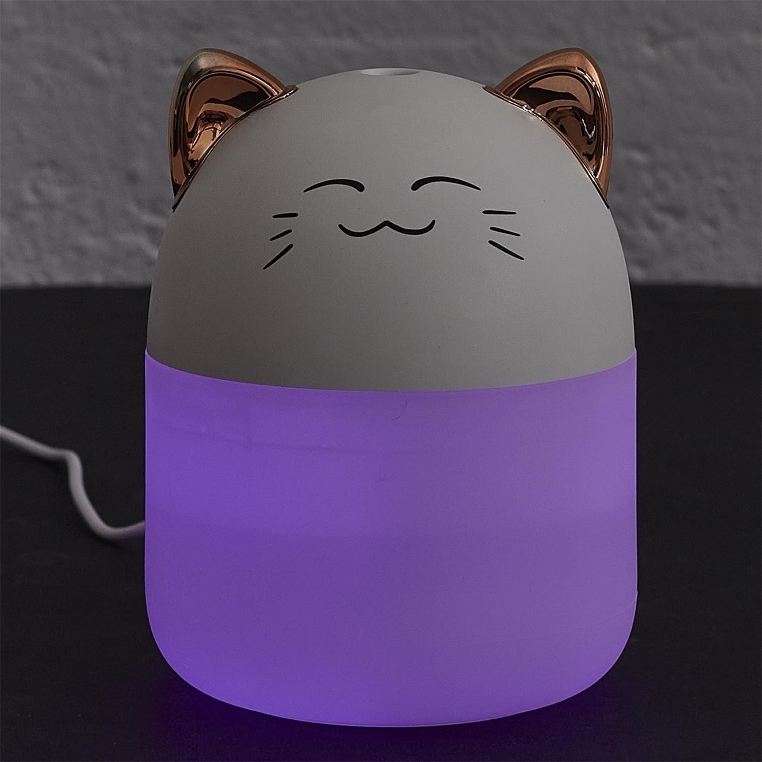 Ez az aranyos, macska alakú párásító, 200 ml kapacitással, nemcsak praktikus eszköz, hanem stílusos dekoratív elem is. USB kábellel táplálva, elbűvöl finom dizájnjával és réz, fényes füleivel, amelyek eleganciát kölcsönöznek neki. A beépített LED világításnak köszönhetően, amely színeket vált, kellemes és pihentető légkört teremt a helyiségben. A párásító finoman szétoszlatja a ködöt, javítja a levegő minőségét a hálószobában, nappaliban vagy irodában, miközben meleg, hangulatos elemet hoz a belső térbe.