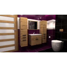 Moderní a jednoduchá koupelnová sestava, která splní svůj praktický i dekorativní účel. Sestava se skládá ze dvou závěsných skříněk, zrcadla a skříňky pod umyvadlo včetně umyvadla. Koupelnová sestava má plastové úchyty v černé barvě. Sestava je vyrobena z lamina tloušťky 18 mm v dekóru dub artisan. Zboží je dodáváno v demontu se schematickým návodem k montáži.